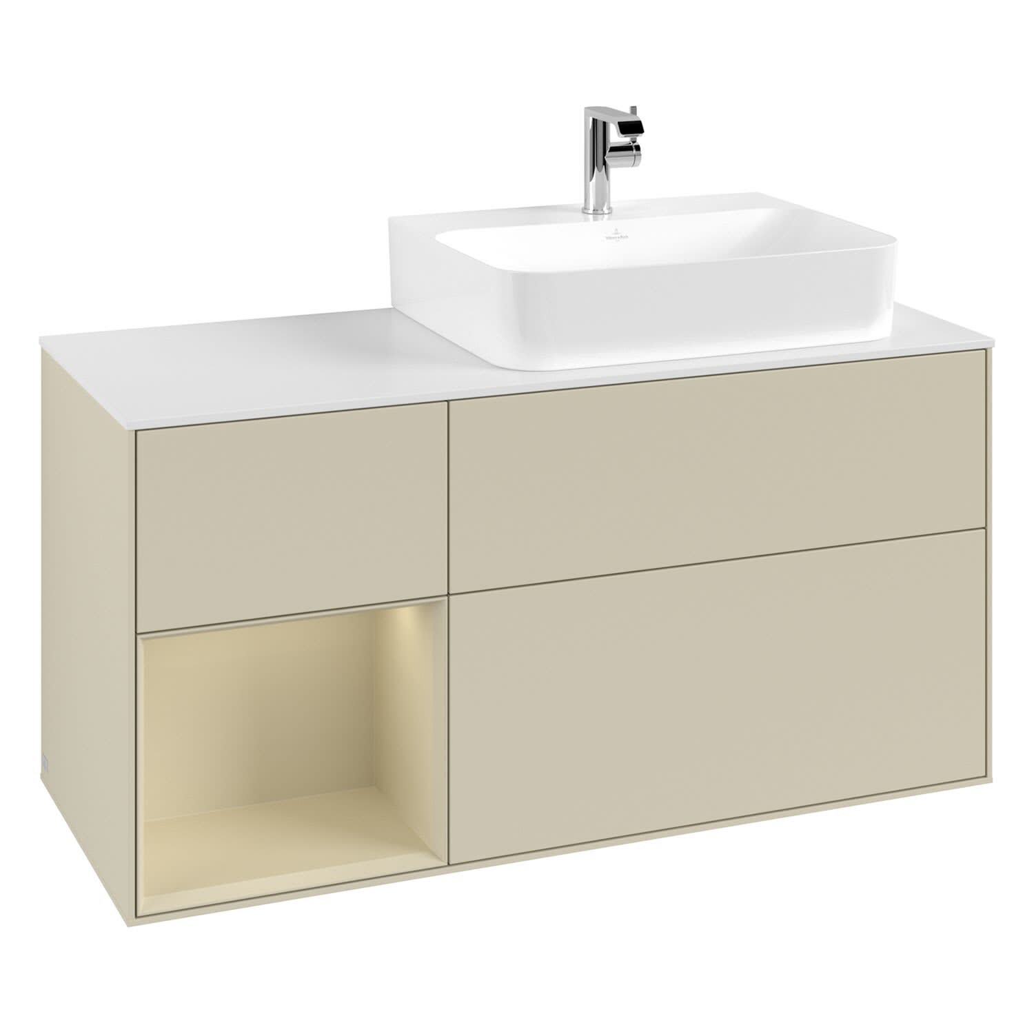 Villeroy & Boch Finion Waschtischunterschrank 120 cm mit Regalelement links, Abdeckplatte, Wandbeleuchtung