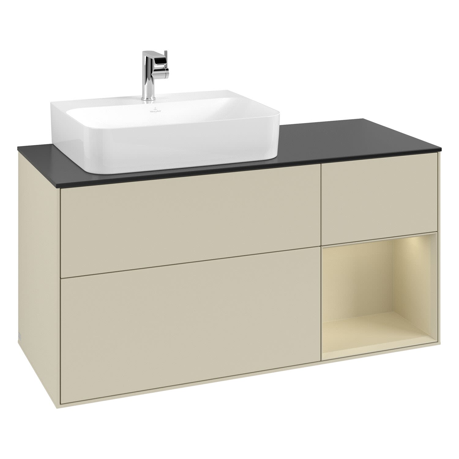 Villeroy & Boch Finion Waschtischunterschrank 120 cm mit Regalelement rechts, Abdeckplatte, Wandbeleuchtung