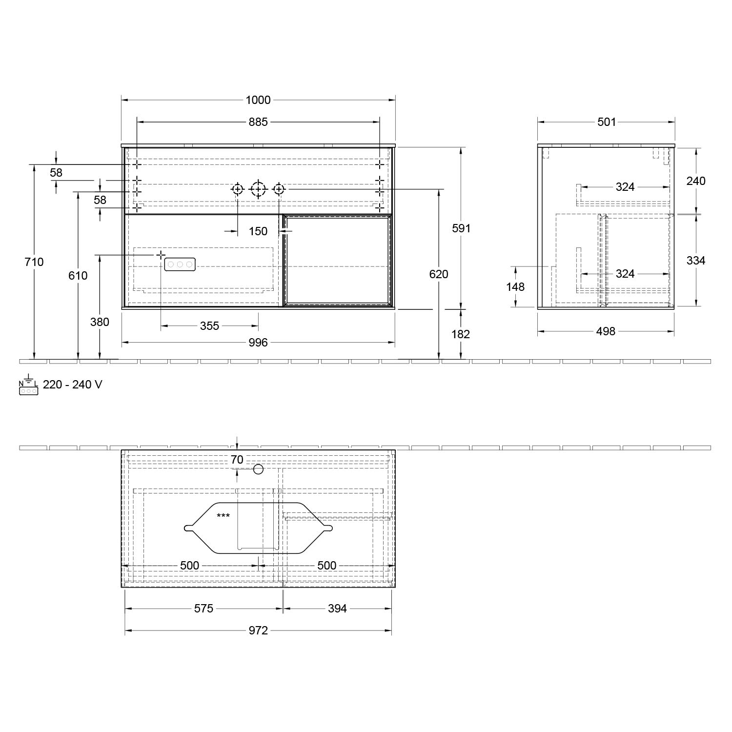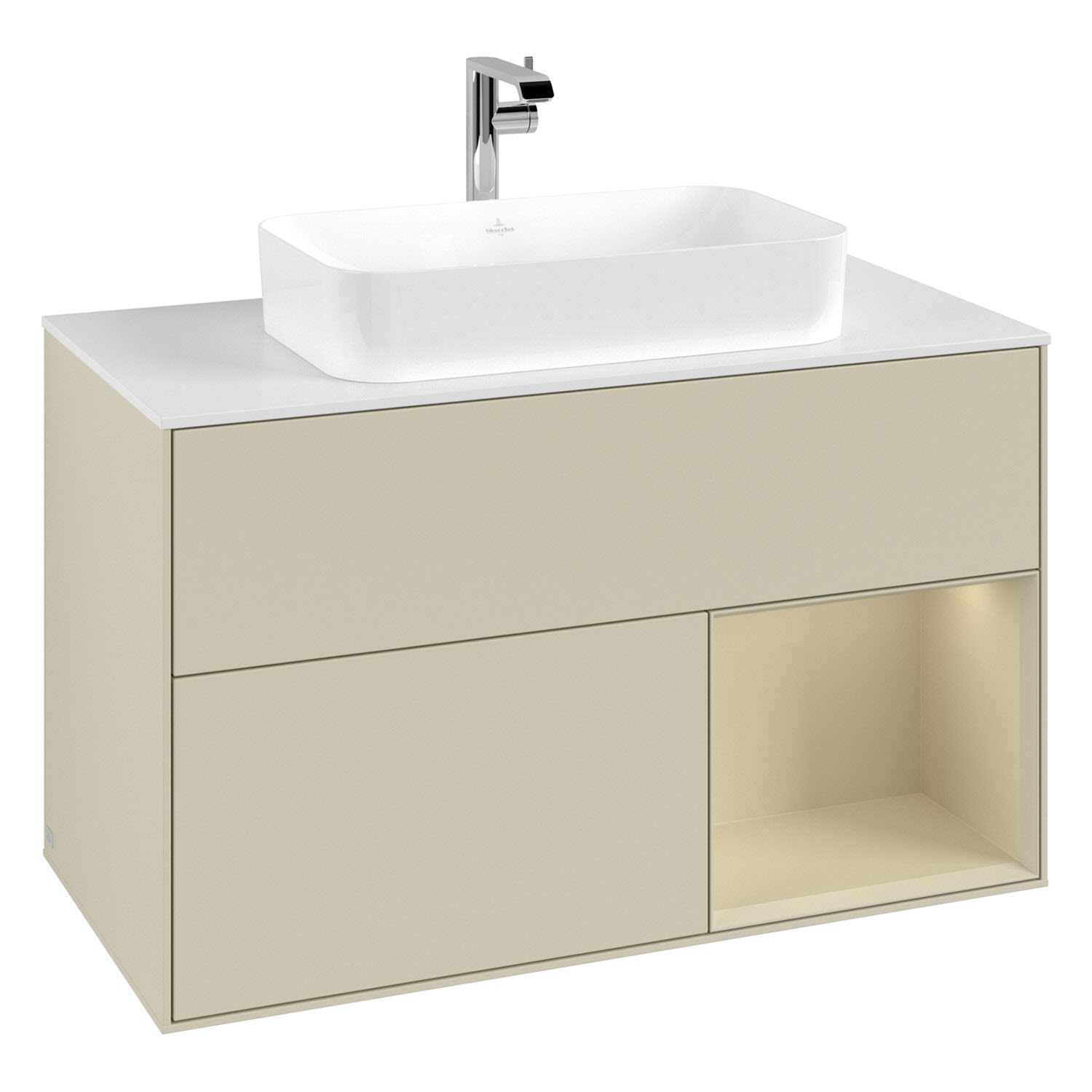 Villeroy & Boch Finion Waschtischunterschrank 100 cm mit Regalelement rechts, Abdeckplatte, Wandbeleuchtung