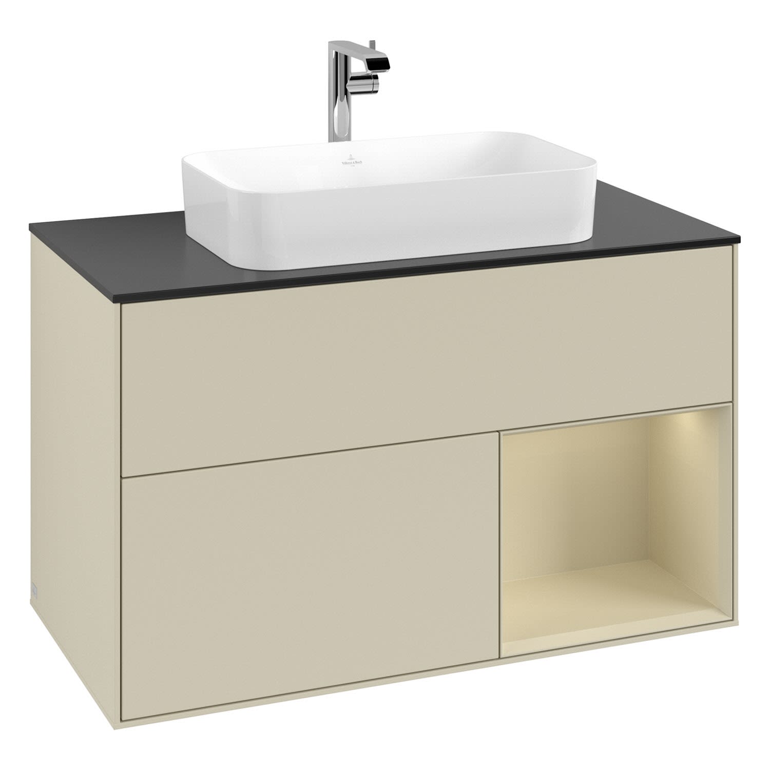 Villeroy & Boch Finion Waschtischunterschrank 100 cm mit Regalelement rechts, Abdeckplatte, Wandbeleuchtung