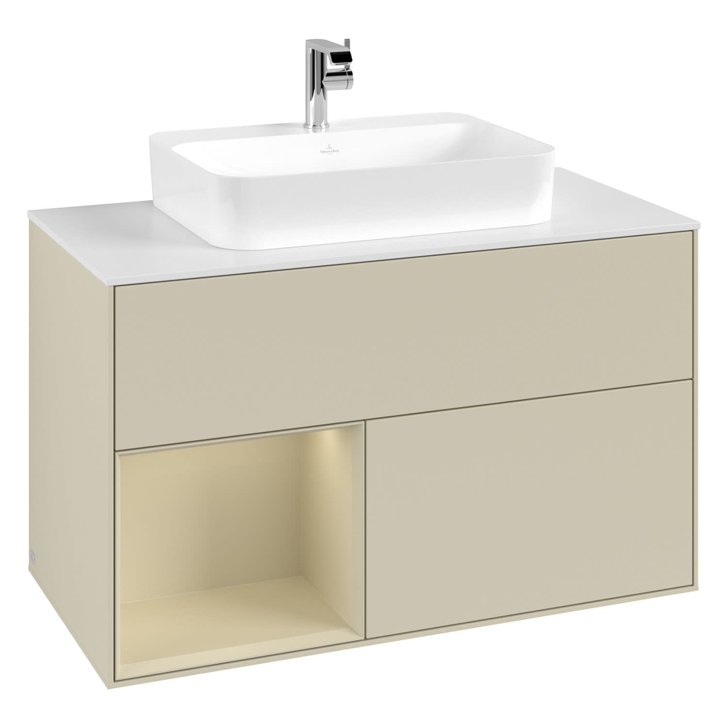 Villeroy & Boch Finion Waschtischunterschrank 100 cm mit Regalelement links, Abdeckplatte, Wandbeleuchtung