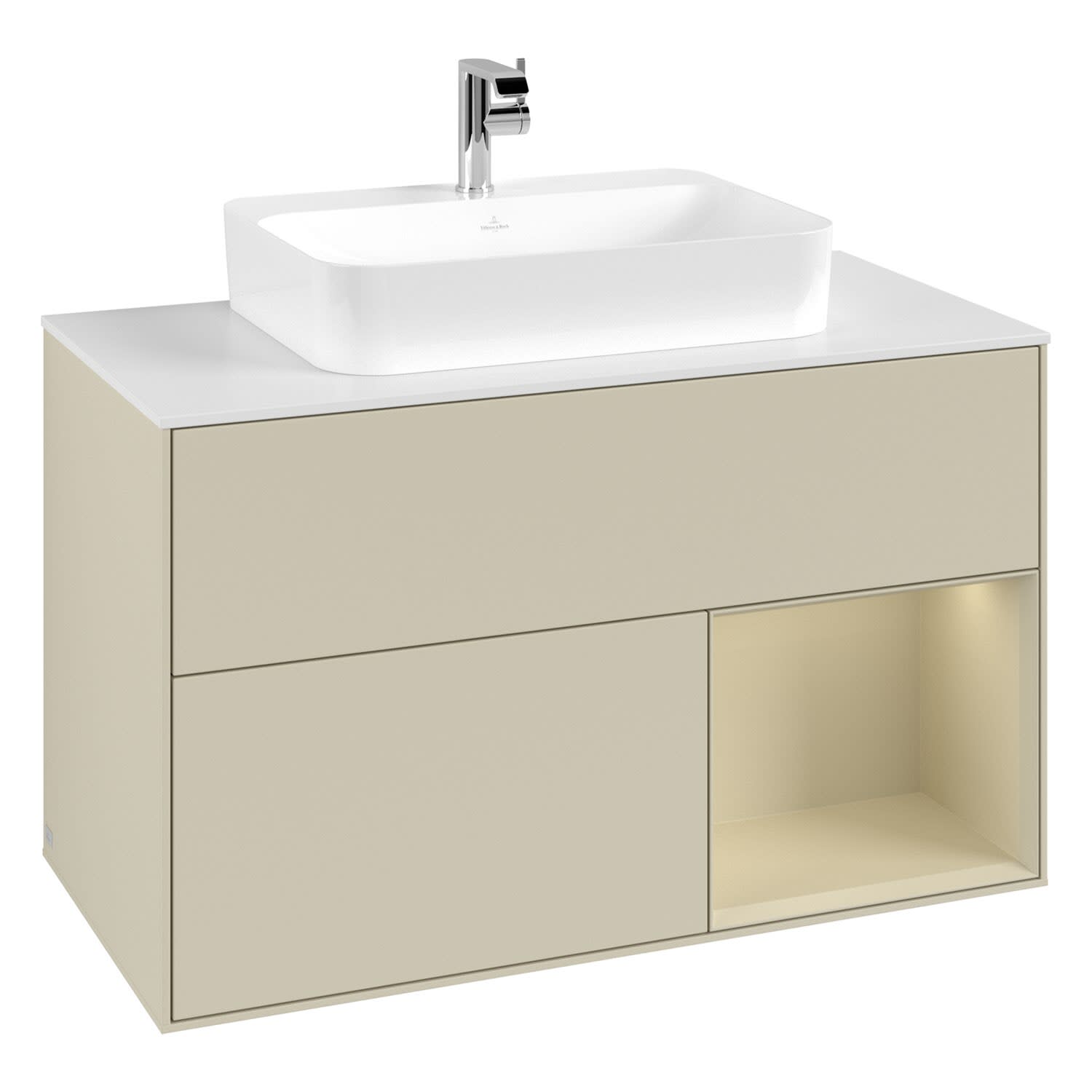 Villeroy & Boch Finion Waschtischunterschrank 100 cm mit Regalelement rechts, Abdeckplatte, Wandbeleuchtung