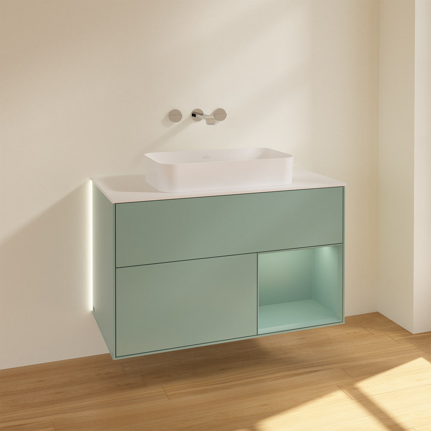 Villeroy & Boch Finion Waschtischunterschrank 100 cm mit Regalelement rechts und Abdeckplatte, mit Wandbeleuchtung