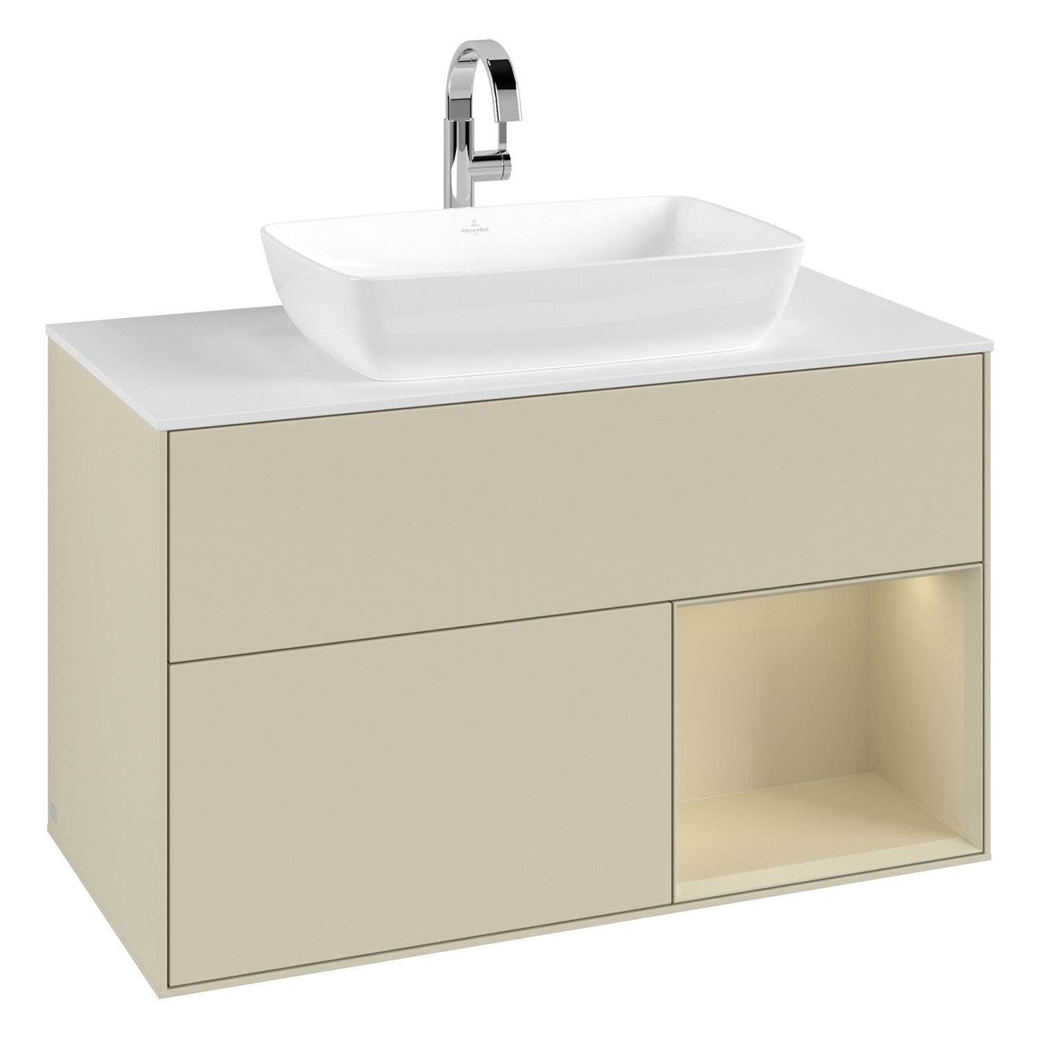 Villeroy & Boch Finion Waschtischunterschrank 100 cm mit Regalelement rechts, Abdeckplatte, Wandbeleuchtung