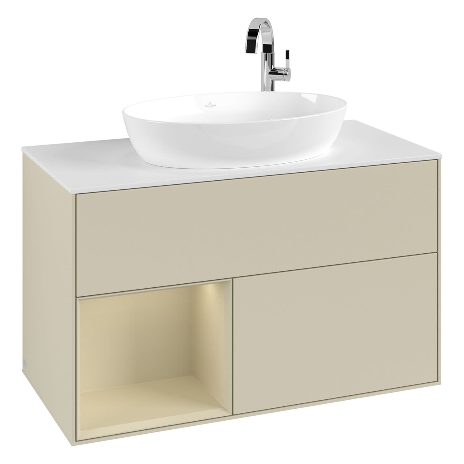 Villeroy & Boch Finion Waschtischunterschrank 100 cm mit Regalelement links, Abdeckplatte, Wandbeleuchtung