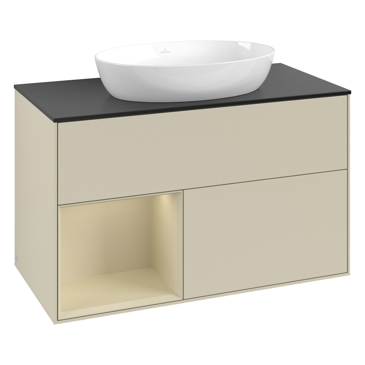 Villeroy & Boch Finion Waschtischunterschrank 100 cm mit Regalelement links, Abdeckplatte, Wandbeleuchtung