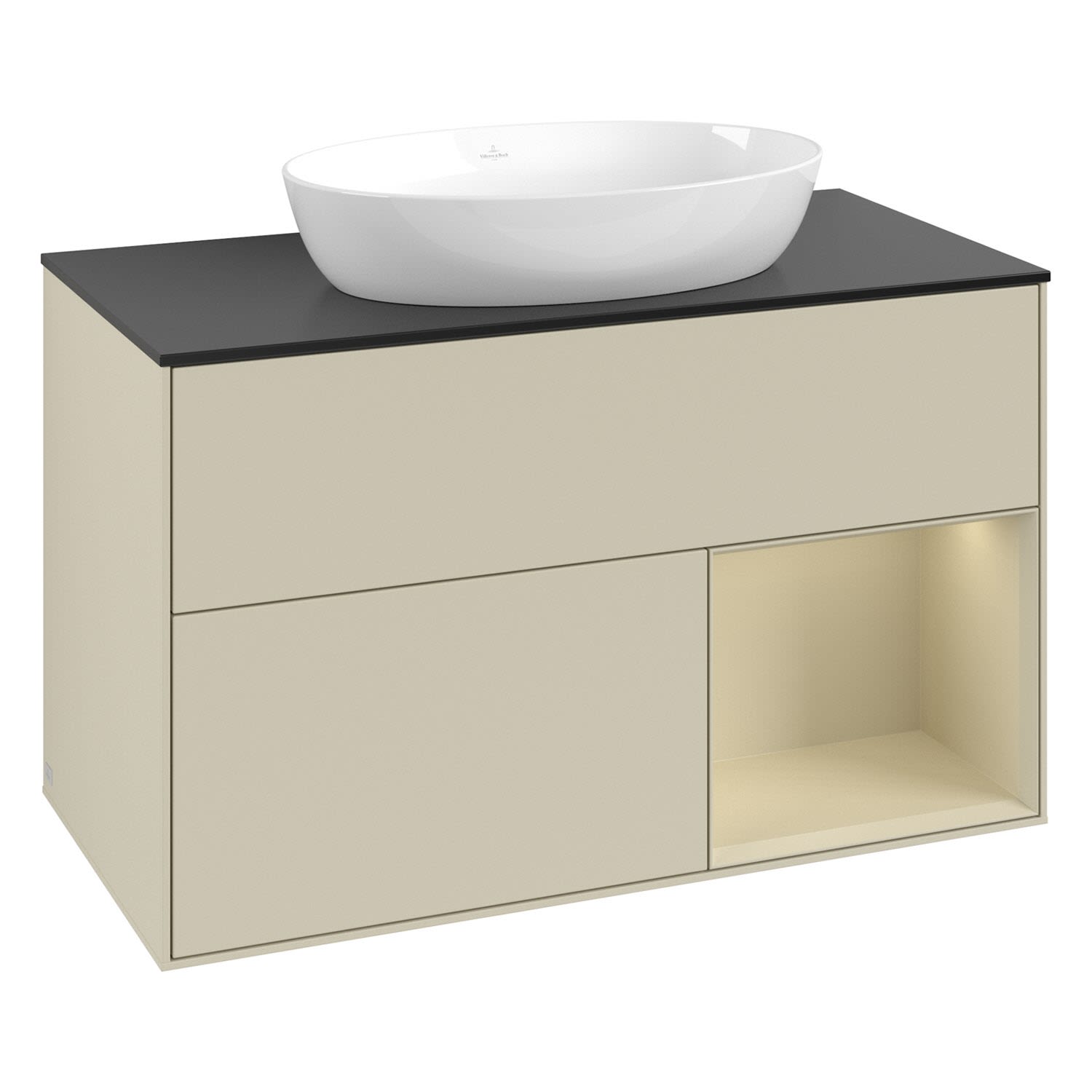 Villeroy & Boch Finion Waschtischunterschrank 100 cm mit Regalelement rechts, Abdeckplatte, Wandbeleuchtung