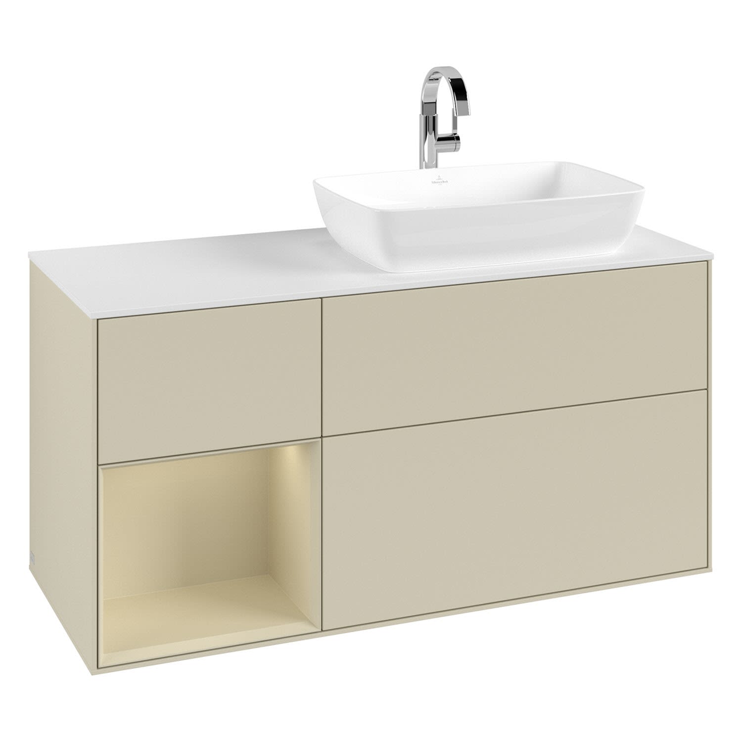 Villeroy & Boch Finion Waschtischunterschrank 120 cm mit Regalelement links, Abdeckplatte, Wandbeleuchtung