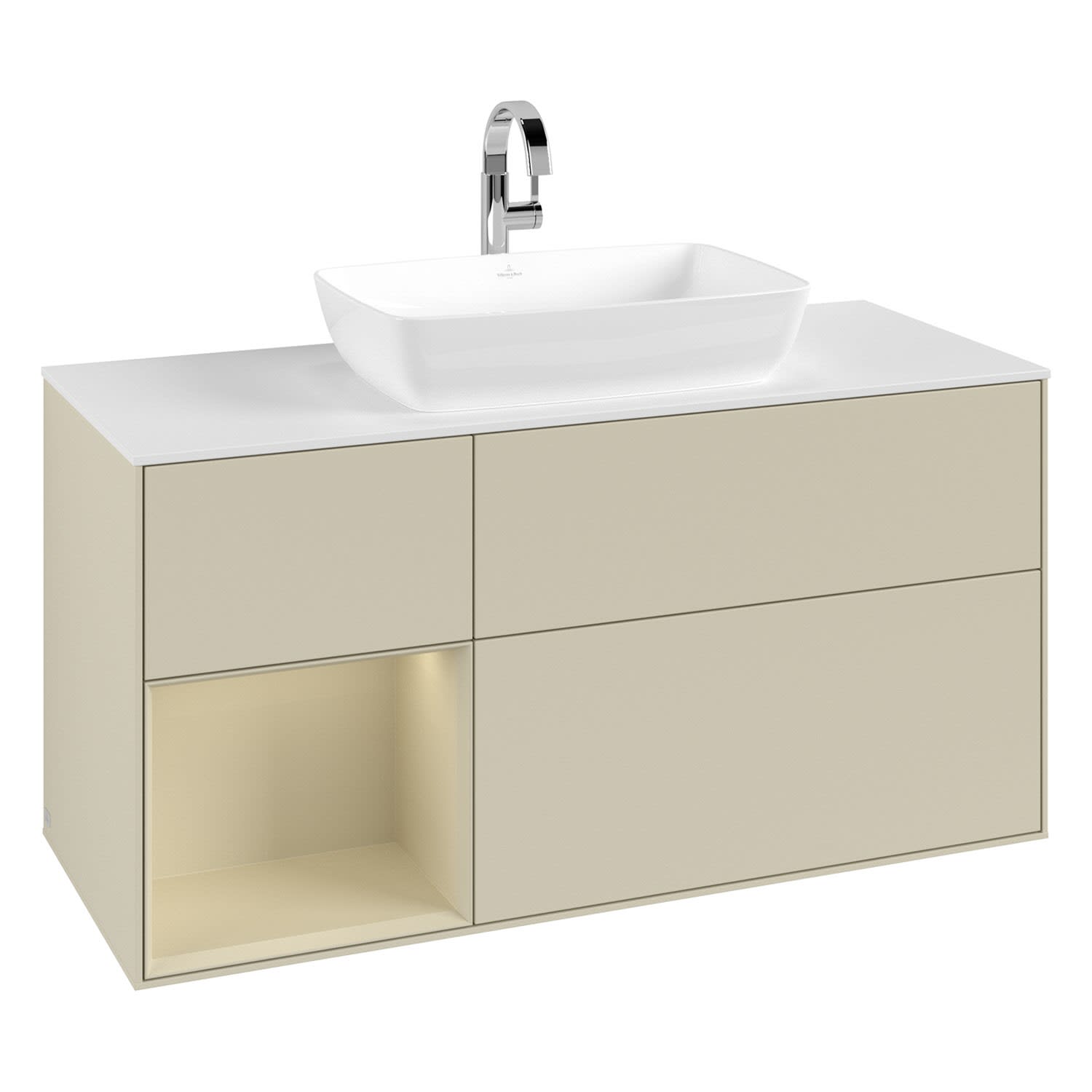 Villeroy & Boch Finion Waschtischunterschrank 120 cm mit Regalelement links, Abdeckplatte, Wandbeleuchtung