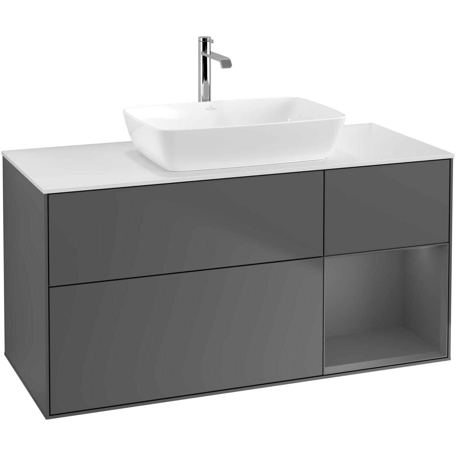 Villeroy & Boch Finion Waschtischunterschrank 120 cm mit Regalelement rechts, Abdeckplatte, Wandbeleuchtung