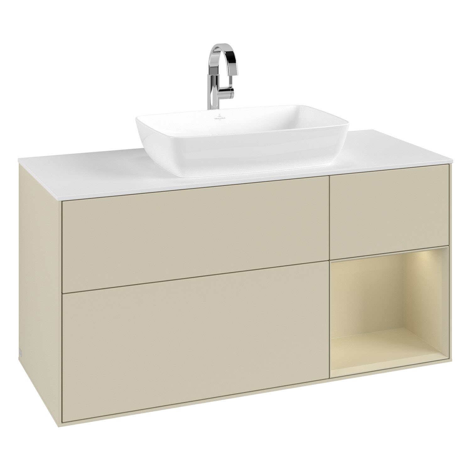 Villeroy & Boch Finion Waschtischunterschrank 120 cm mit Regalelement rechts, Abdeckplatte, Wandbeleuchtung
