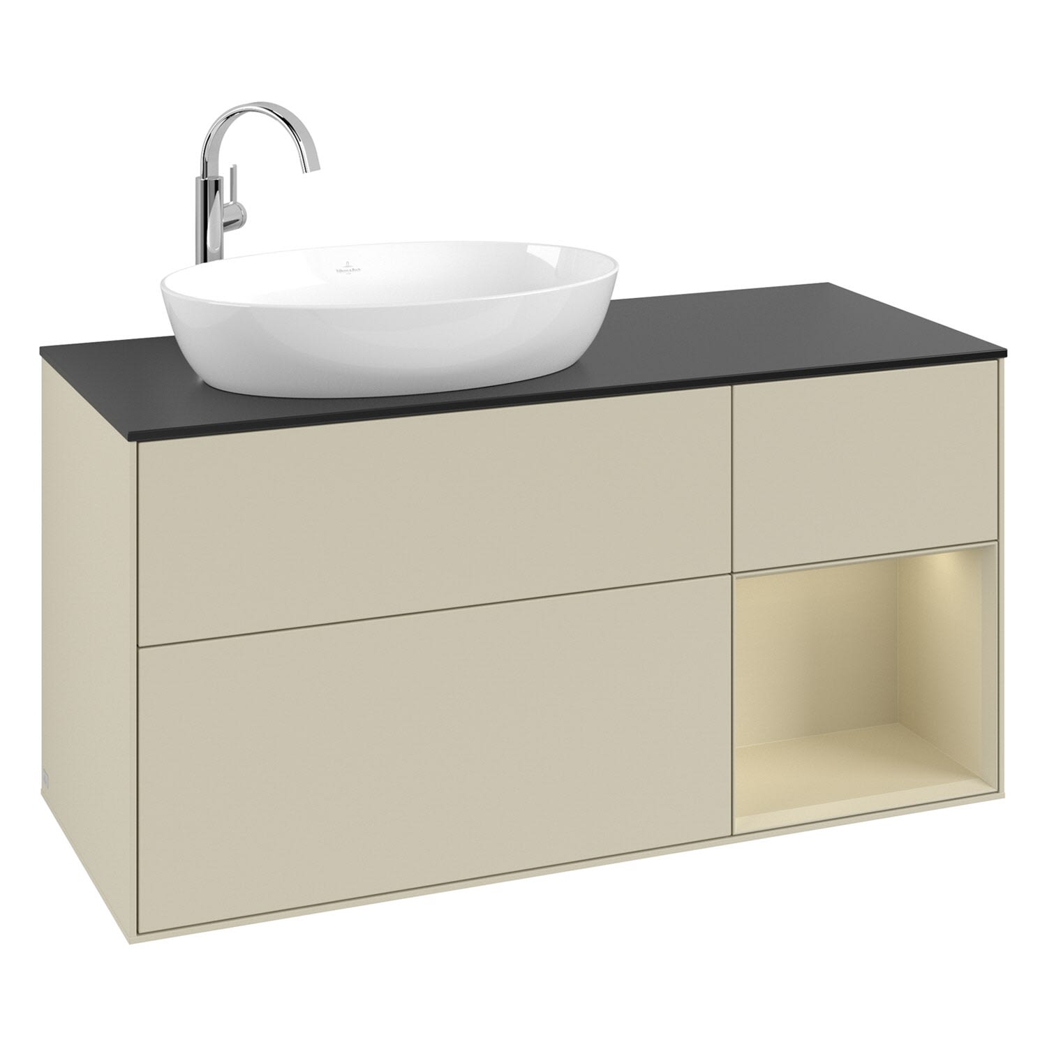 Villeroy & Boch Finion Waschtischunterschrank 120 cm mit Regalelement rechts, Abdeckplatte, Wandbeleuchtung