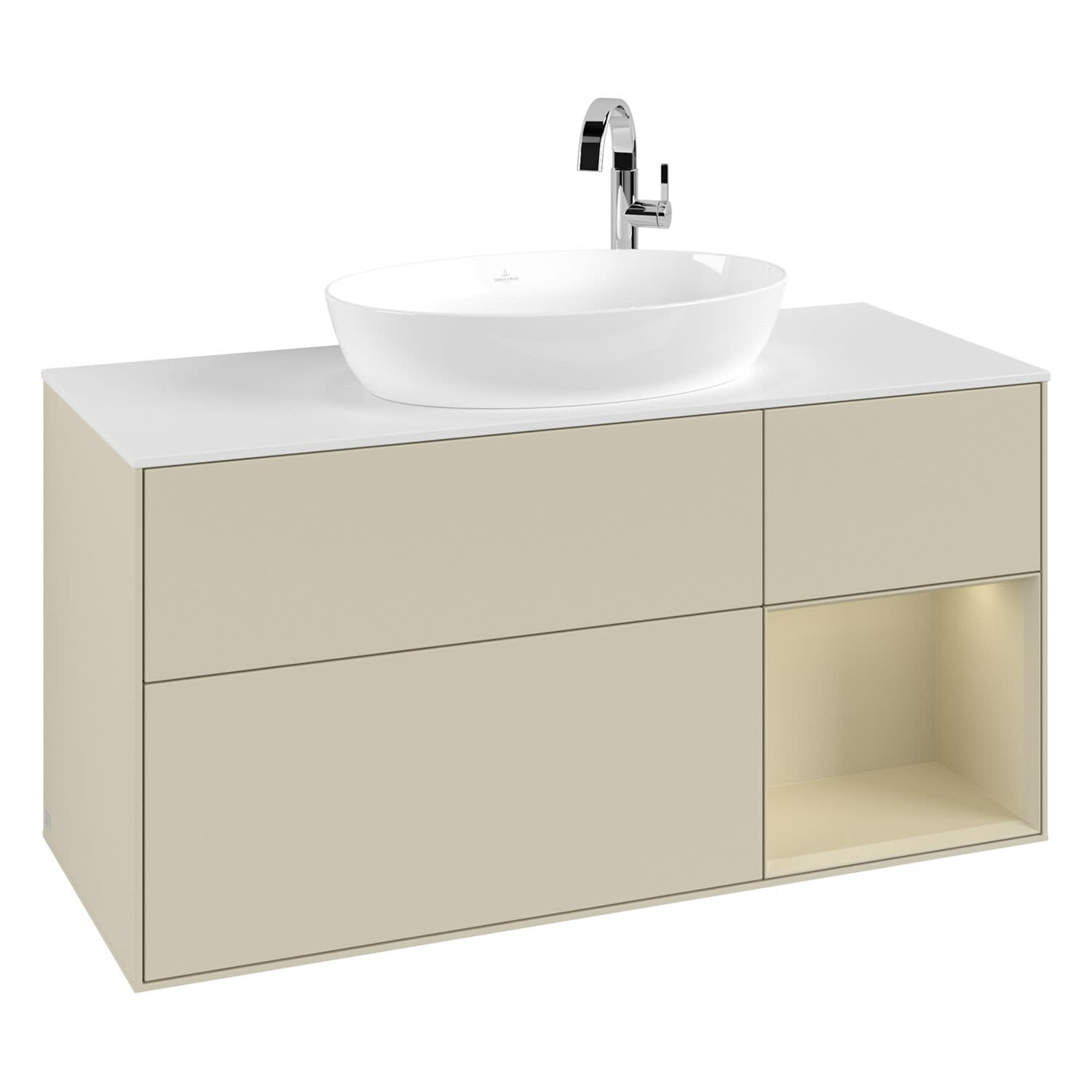 Villeroy & Boch Finion Waschtischunterschrank 120 cm mit Regalelement rechts, Abdeckplatte, Wandbeleuchtung