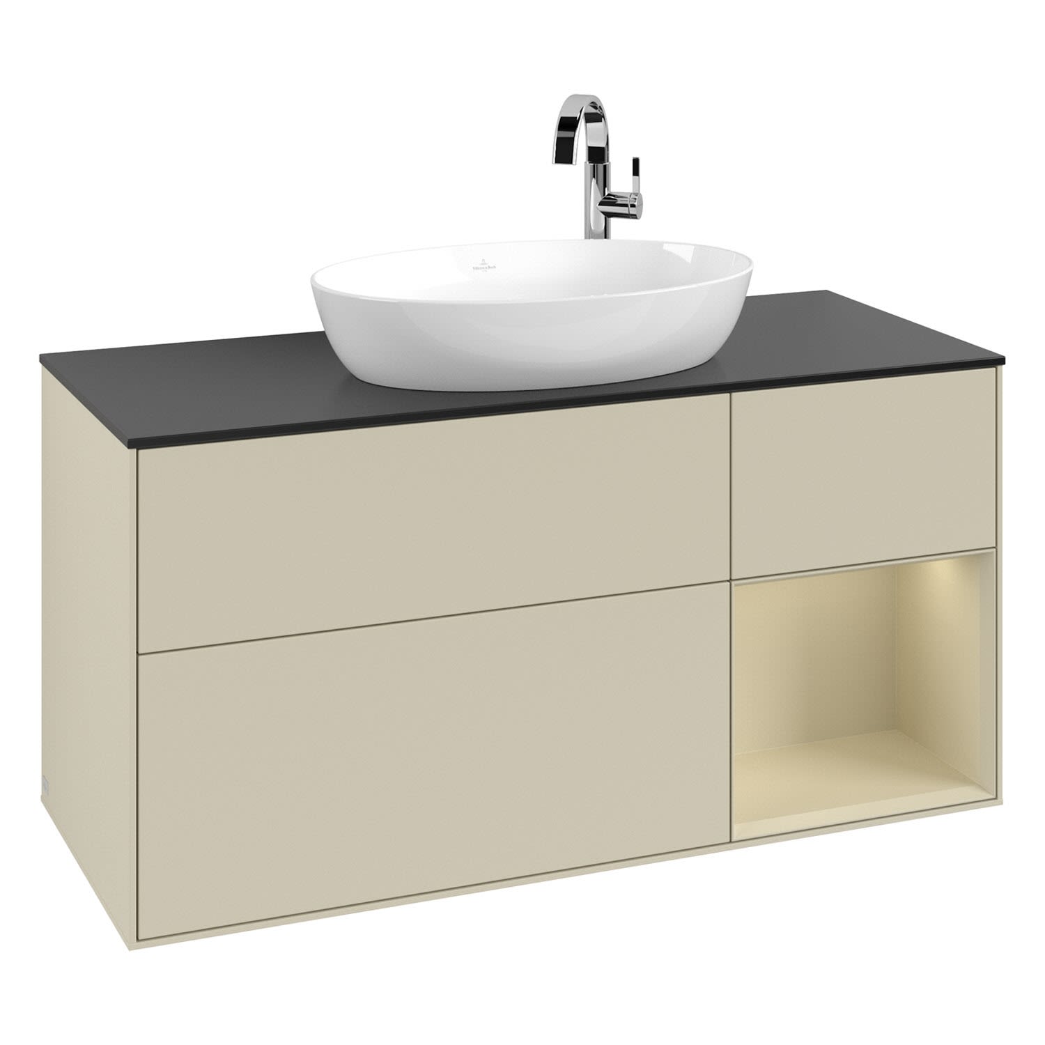 Villeroy & Boch Finion Waschtischunterschrank 120 cm mit Regalelement rechts, Abdeckplatte, Wandbeleuchtung