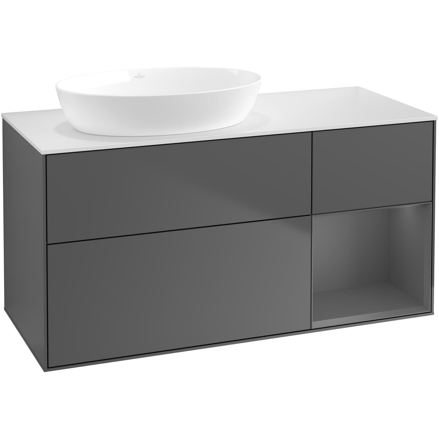 Villeroy & Boch Finion Waschtischunterschrank 120 cm mit Regalelement rechts, Abdeckplatte, Wandbeleuchtung