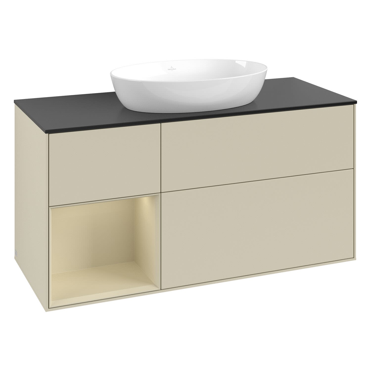 Villeroy & Boch Finion Waschtischunterschrank 120 cm mit Regalelement links, Abdeckplatte, Wandbeleuchtung