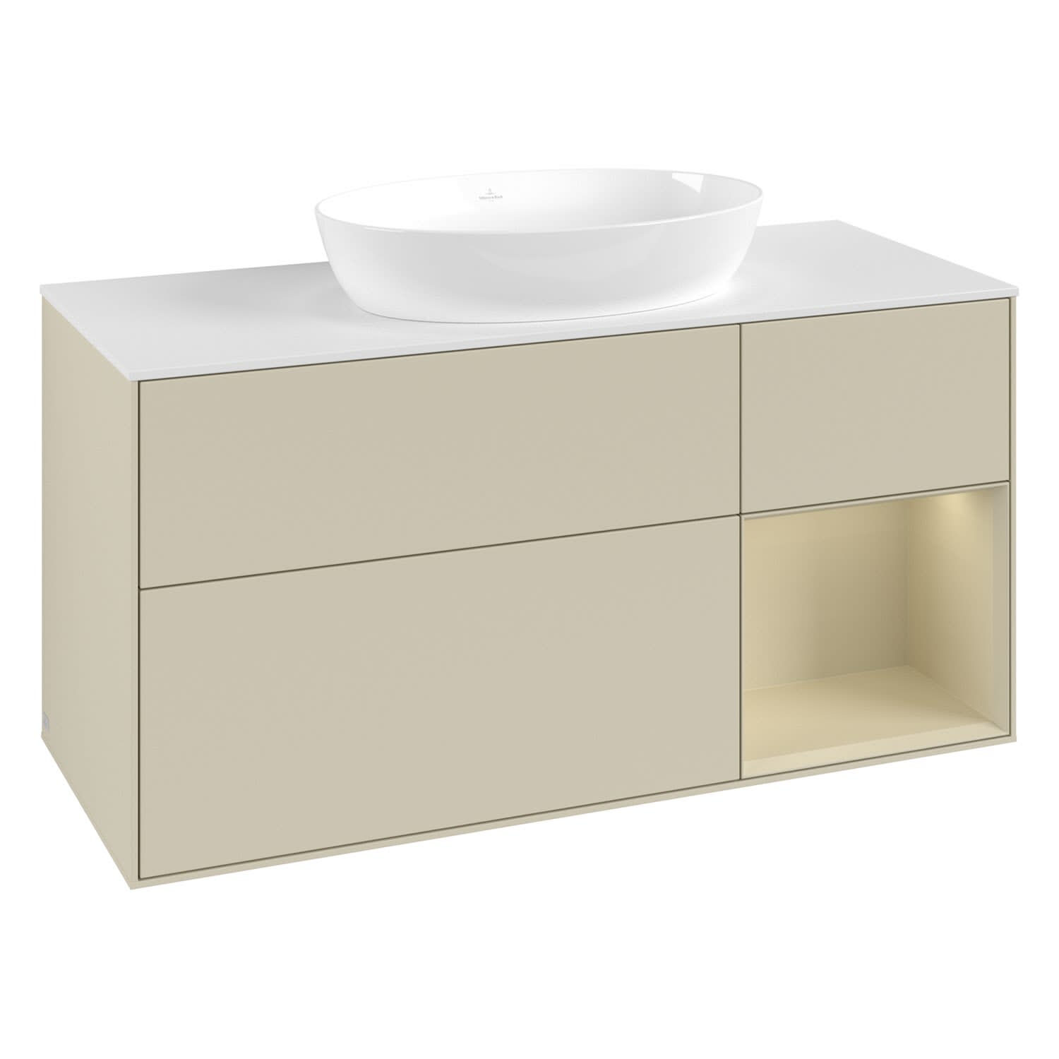 Villeroy & Boch Finion Waschtischunterschrank 120 cm mit Regalelement rechts, Abdeckplatte, Wandbeleuchtung
