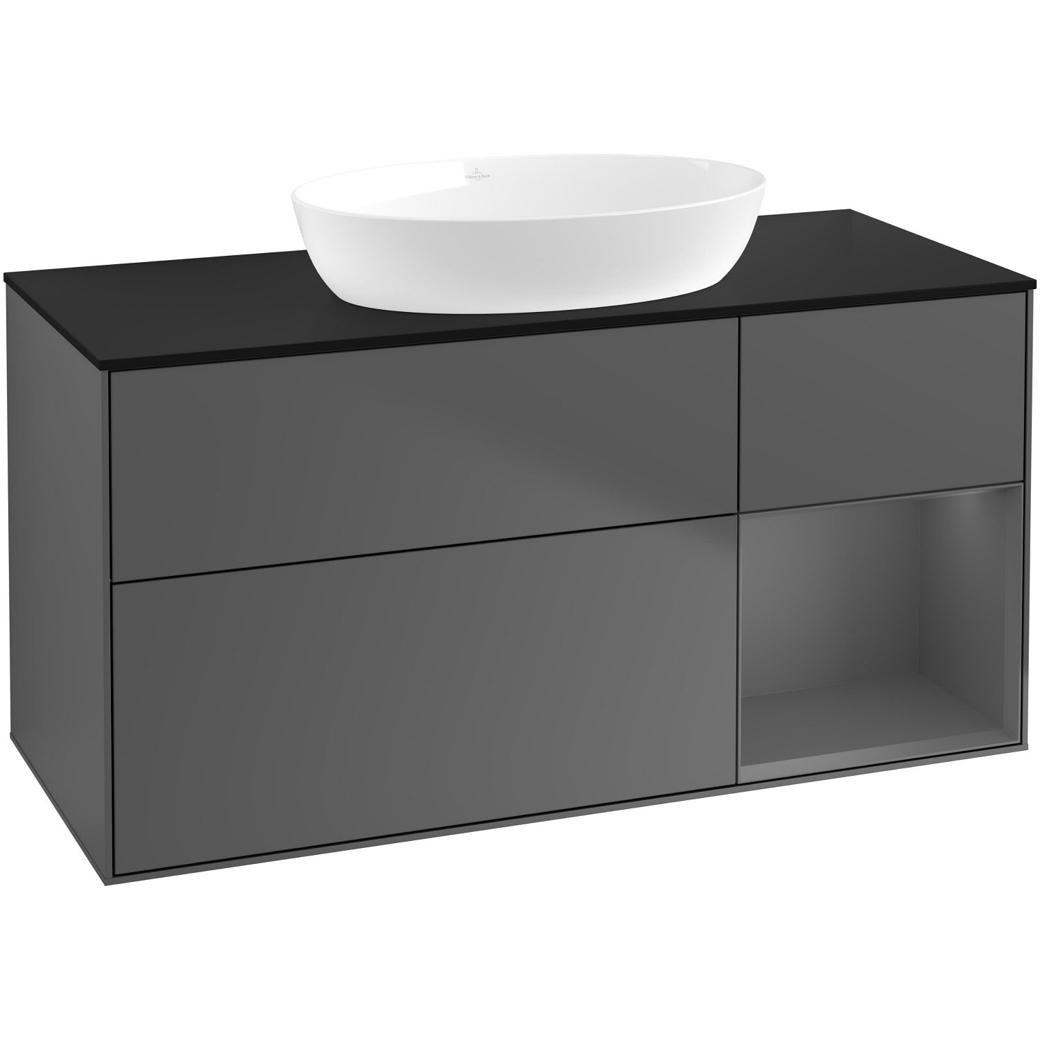 Villeroy & Boch Finion Waschtischunterschrank 120 cm mit Regalelement rechts, Abdeckplatte, Wandbeleuchtung