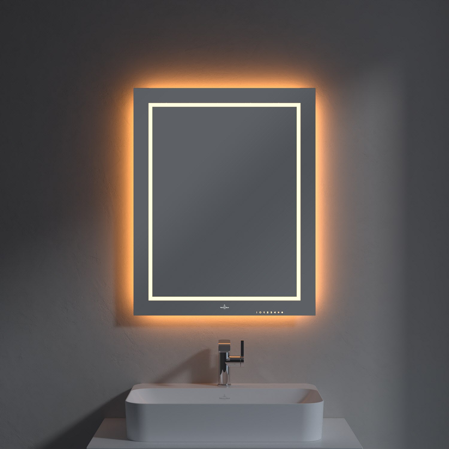 Ausgezeichnetes Design trifft auf innovative Technik: Der rechteckige Finion Badspiegel von Villeroy & Boch überzeugt mit seinem innovativen Beleuchtungskonzept aus einer direkten und indirekten Lichtquelle. Die umlaufende LED-Beleuchtung sowie die dezente Wandbeleuchtung sind über eine Fernbedienung steuerbar und stufenlos dimmbar von Warmweiß bis Tageslichtweiß. Damit wird der Spiegel zum stilvollen Designelement und schafft eine stimmungsvolle Atmosphäre in jedem Badezimmer.