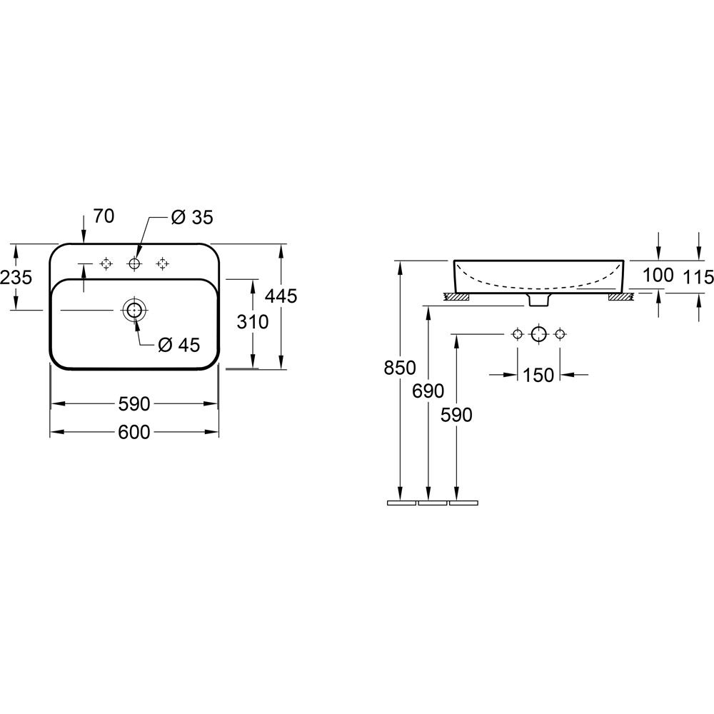 Villeroy & Boch Finion Aufsatzwaschtisch 60 x 44,5 cm mit Hahnloch, mit ViFlow Überlauf