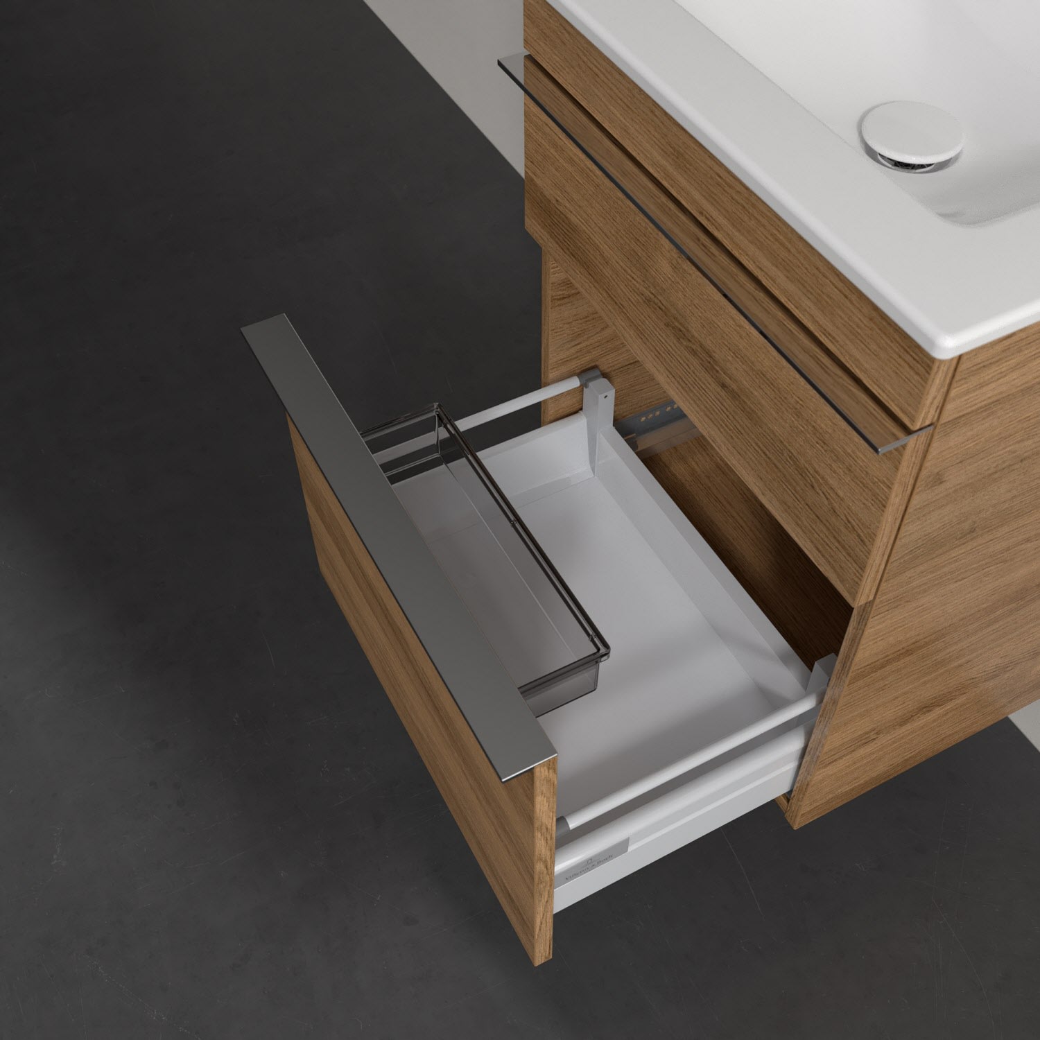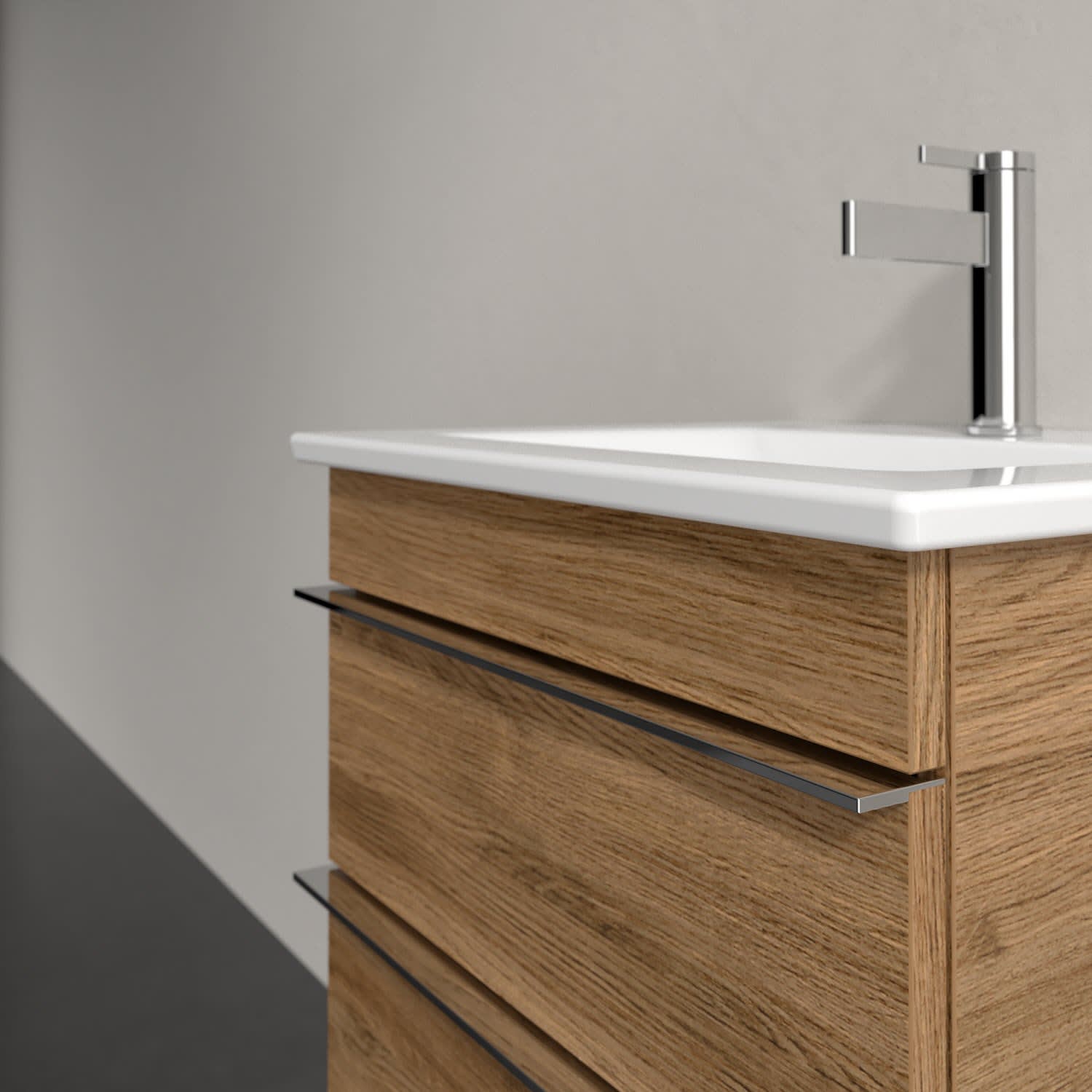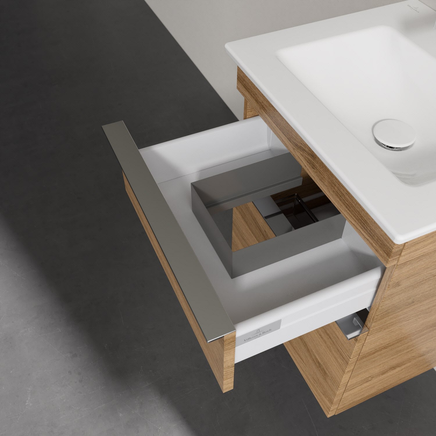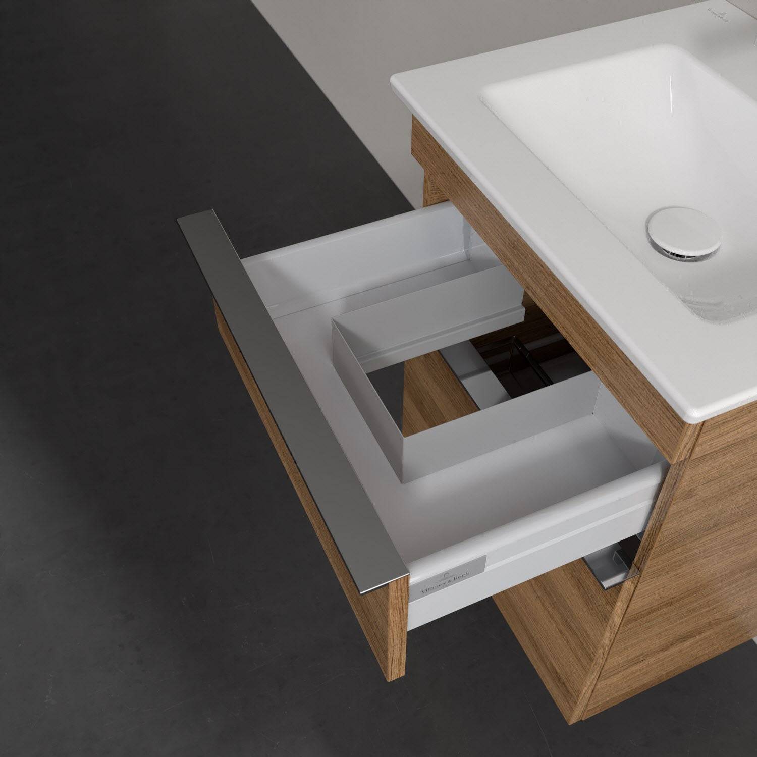 Funktional und designstark: Der elegante Waschbeckenunterschrank der Kollektion Venticello von Villeroy & Boch überzeugt mit kompakten Maßen und besonders viel Stauraum dank XXL-Höhe. Das macht ihn zur idealen Lösung für kleine Bäder und Gästebäder. In einem kleinen und einem großen, vollausziehbaren und geräumigen Auszug lassen sich jede Menge Badutensilien oder Toilettenpapier ordentlich verstauen. Dank Selbsteinzug und SoftClosing-Funktion schließen die Auszüge im Anschluss sicher und geräuschlos. Ein weiteres Plus ist die schicke Optik: Die direktbeschichtete, pflegeleichte Oberfläche überzeugt mit reduzierter Linienführung und dezent aufgesetzter Griffleiste.