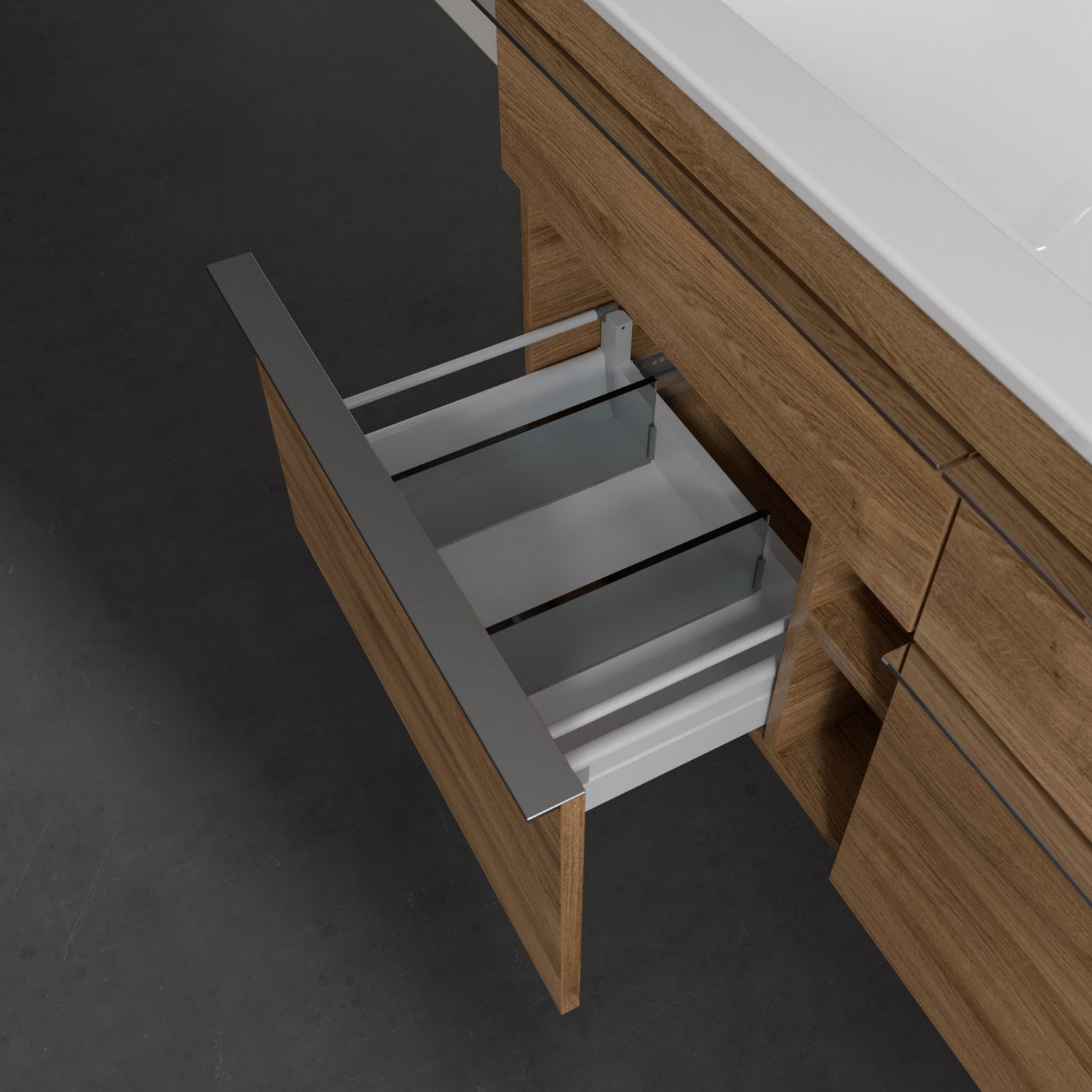 - kein Umfallen oder Verrutschen von Pflegeprodukten in den Schubladen dank rutschhemmendem Boden