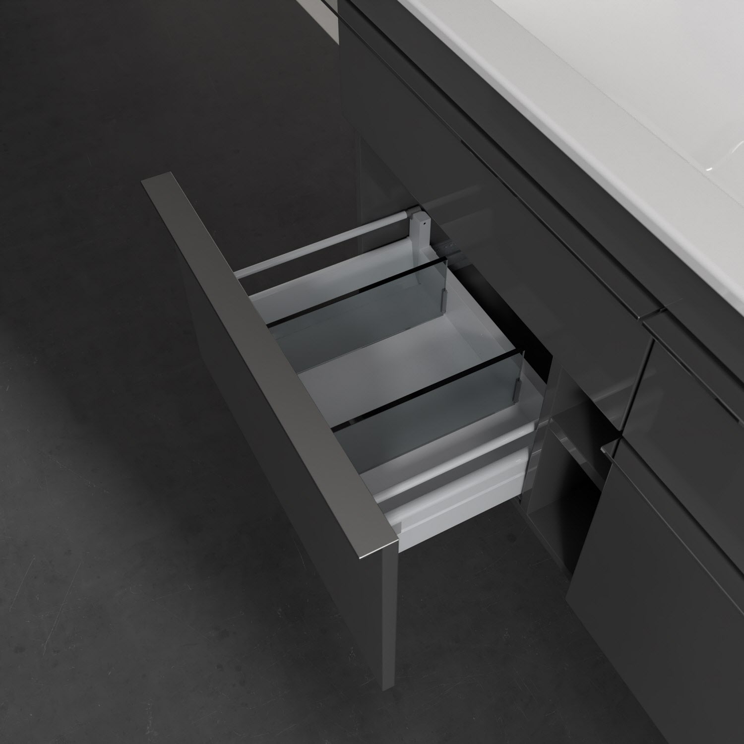 - kein Umfallen oder Verrutschen von Pflegeprodukten in den Schubladen dank rutschhemmendem Boden
