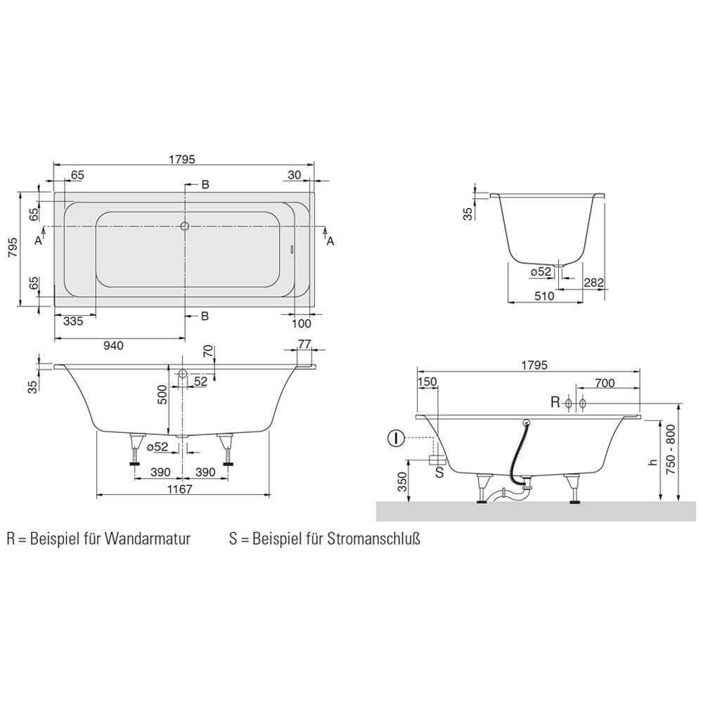 Villeroy & Boch Architectura Duo Badewanne 180 x 80 cm, Airpool Comfort, Technik Position 1, mit Trio Ablaufgarnitur