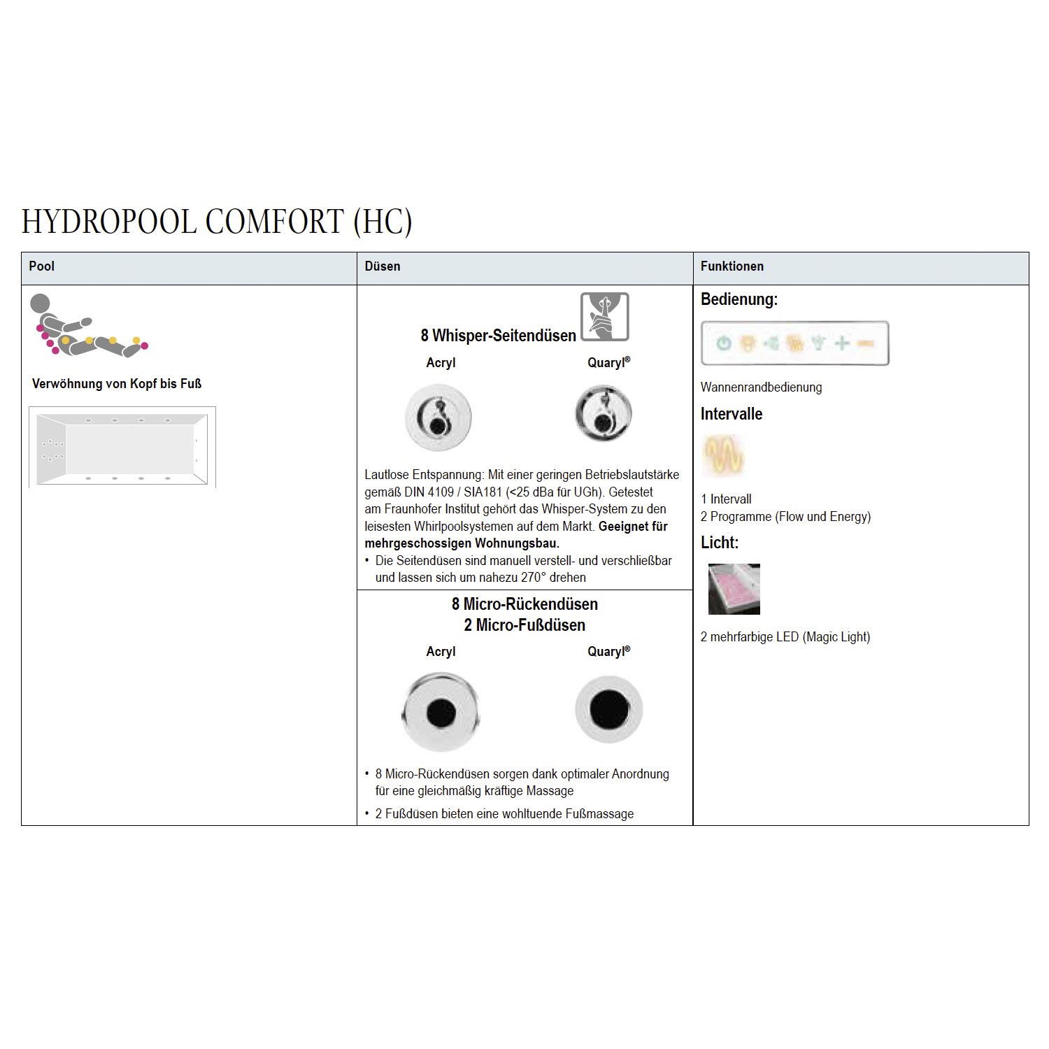 - 8 ergonomisch angeordnete Micro-Rückendüsen sorgen für eine angenehme Massage des unteren und oberen Rücken sowie den Schultern