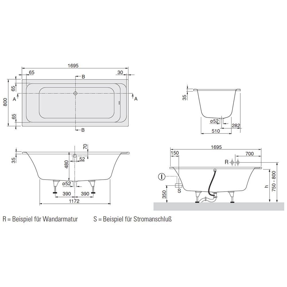Villeroy & Boch Architectura Duo Badewanne 170 x 80 cm, Hydropool Entry, Technik Position 2