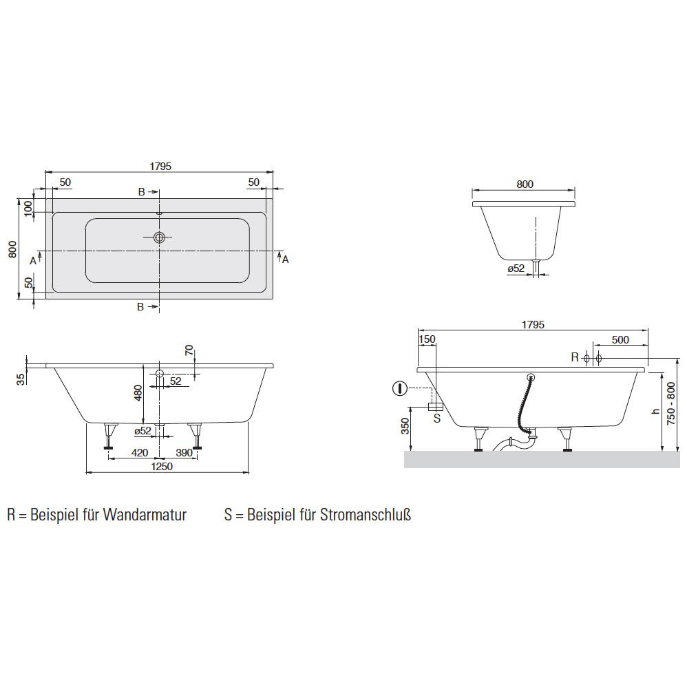 Villeroy & Boch Subway Duo-Badewanne 180 x 80 cm, Special Combi Pool Active, Technik Position 1