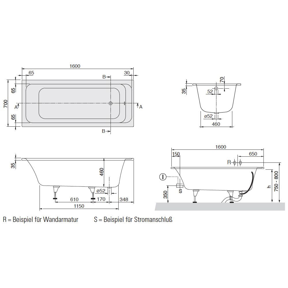 Villeroy & Boch Architectura Solo Badewanne 160 x 70 cm, Special Combi Pool Active, Technik Position 2, mit Trio Ablaufgarnitur