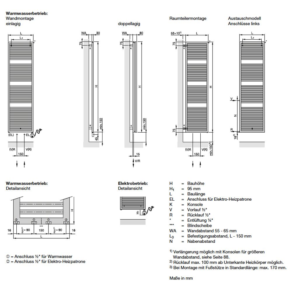 - mit versenkten Anschlüssen am unteren Vierkantrohr, mittig 1/2" für Vorlauf/Rücklauf