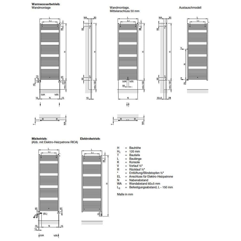 - Anschluss an Warmwasser-Zentralheizung mit Mittelanschluss 5 cm