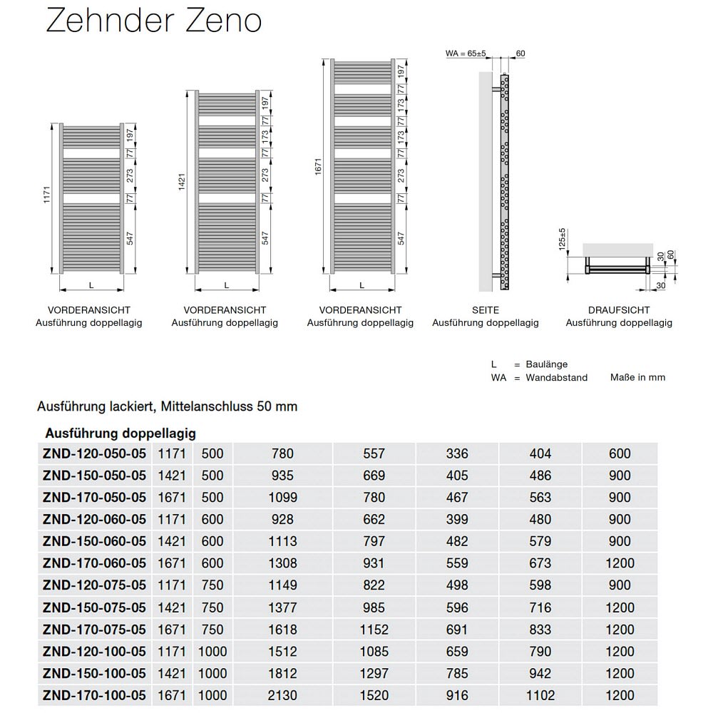 Zehnder Zeno ZND-170-075-05 Badheizkörper doppellagig 75 x 167,1 cm mit Mittelanschluss