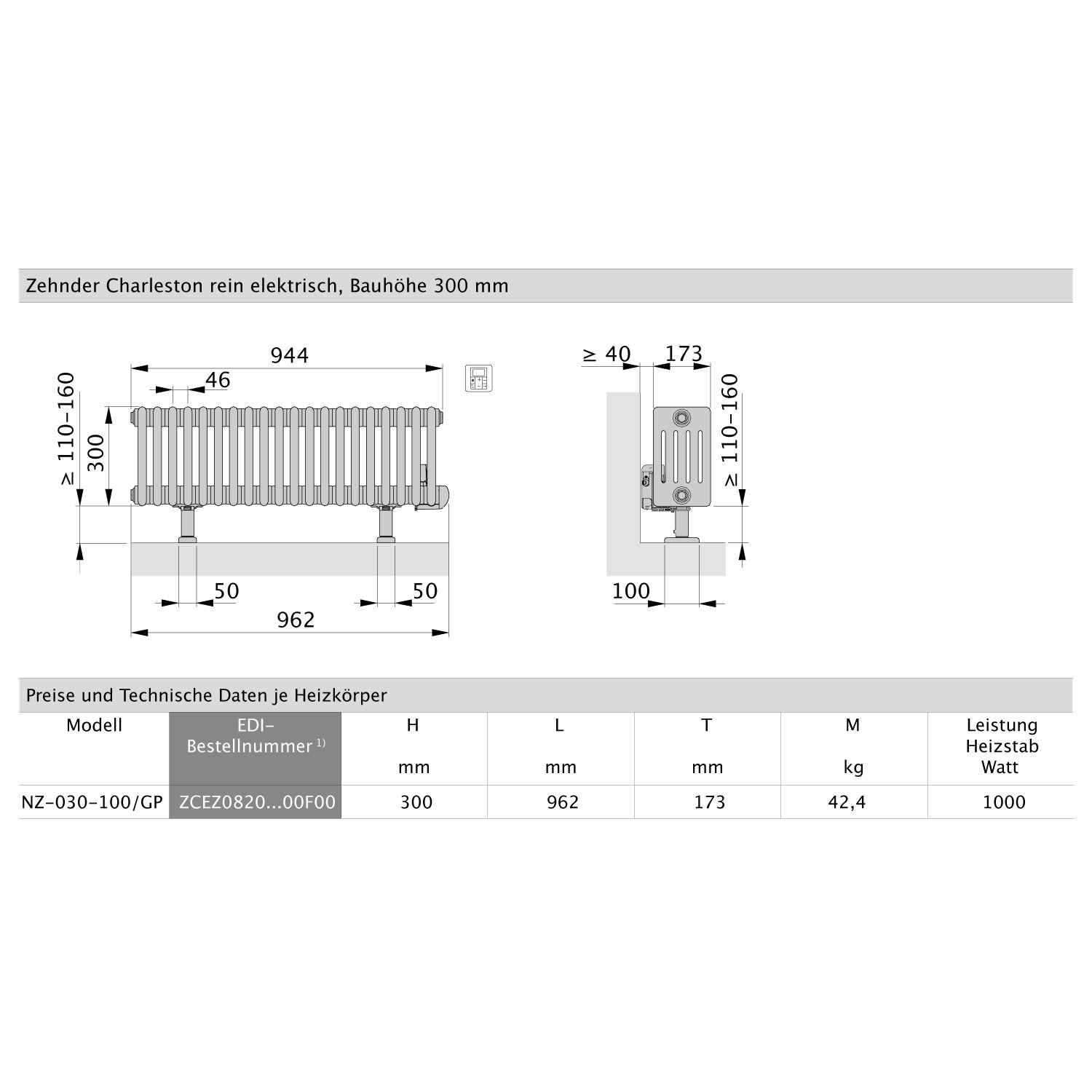 Zehnder Charleston NZ-030-100/GP Heizkörper 96,2 x 30 cm Elektro-Anschluß