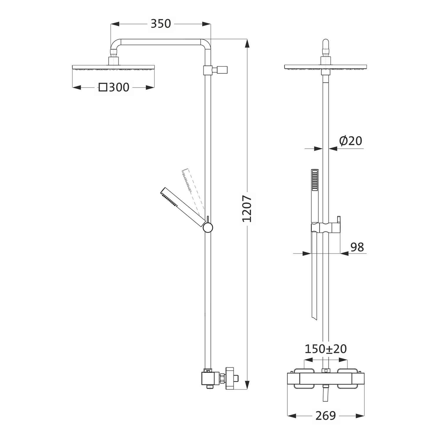 - Ausladung Brausearm 35 cm (nicht schwenkbar)