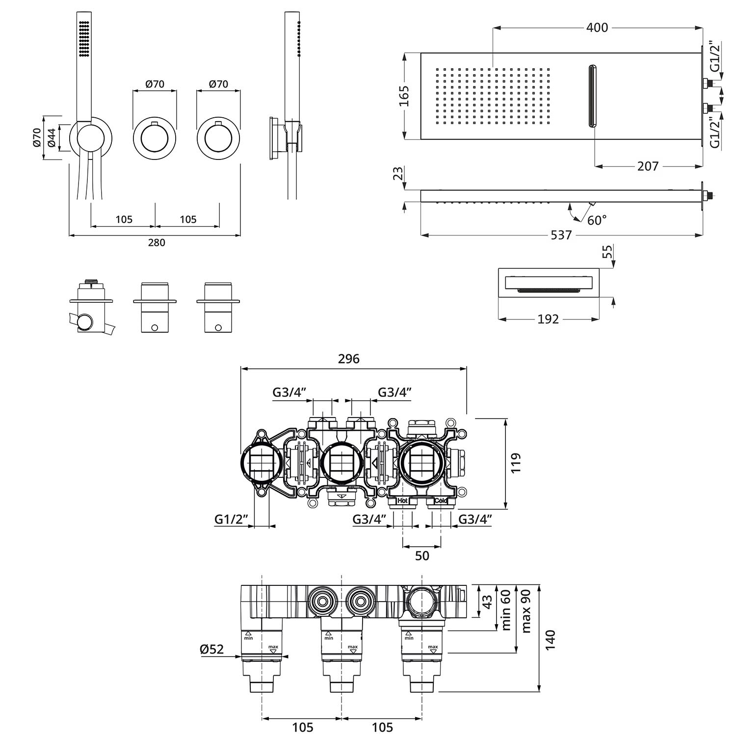 mit Thermostat und Regenbrause eckig