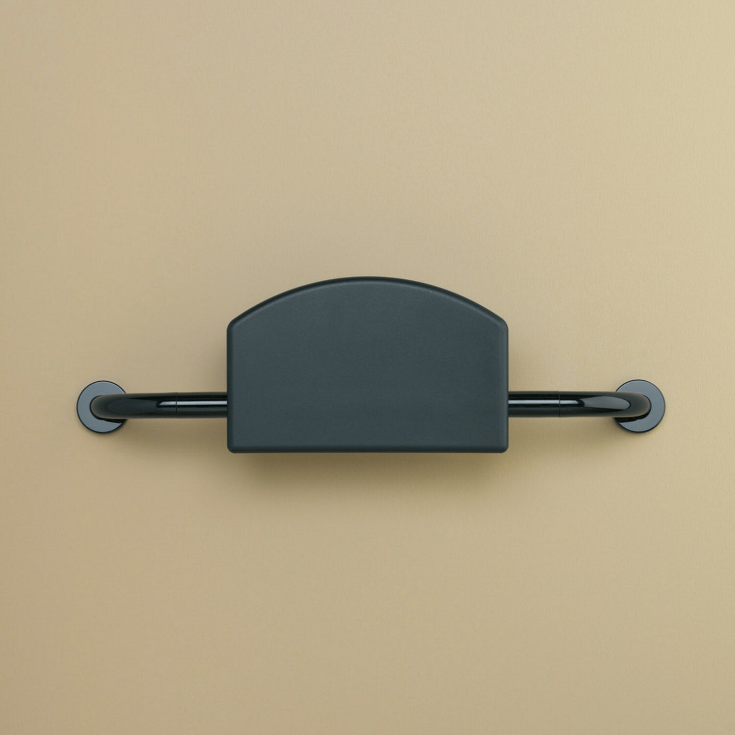 - gepolsterte Lehne mit beidseitig angebrachten, rechtwinklig gebogenen Stangen und Befestigungsrosetten