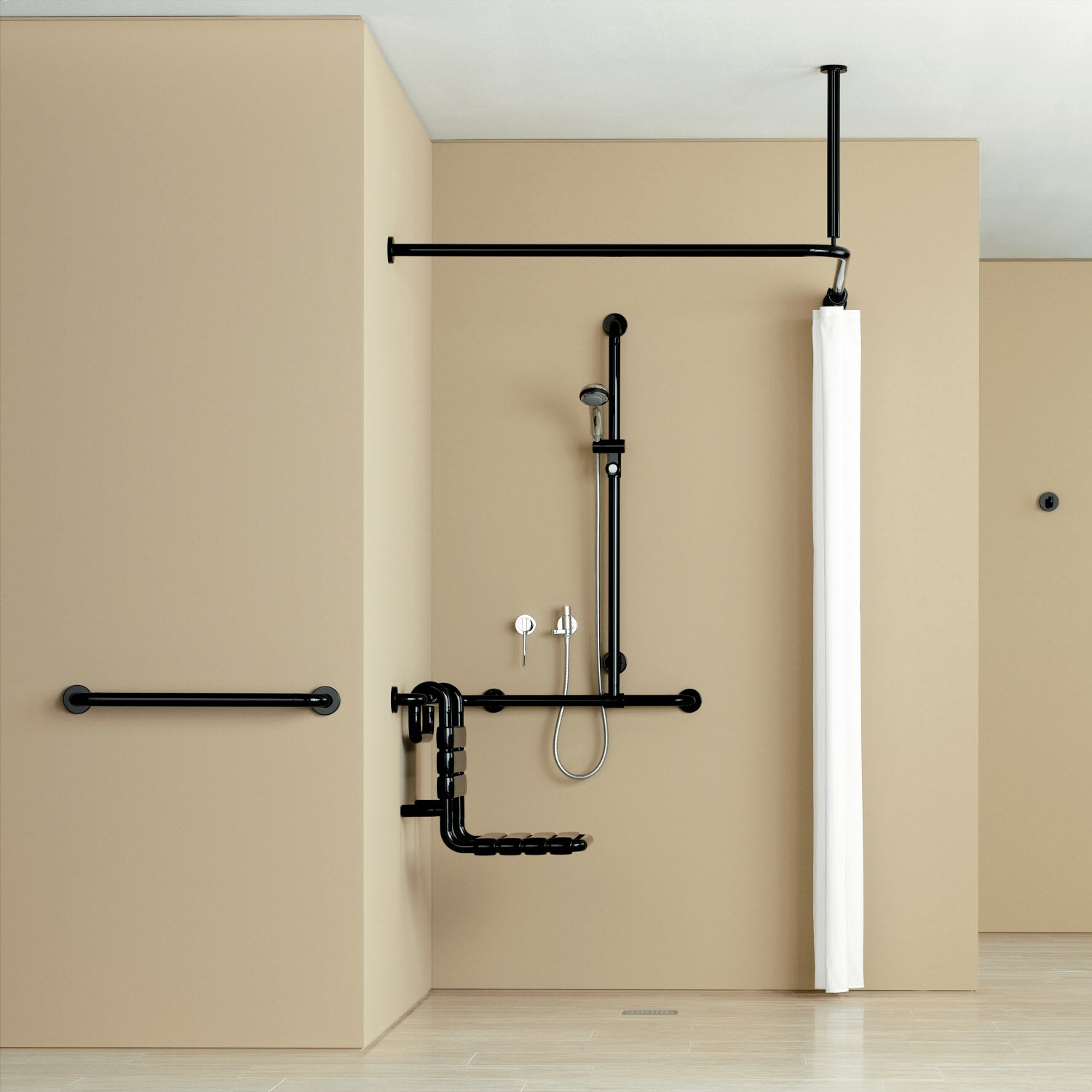 - senkrecht und waagerecht angeordnete, im rechten Winkel verbundene Stangen mit Stahl-Befestigungsrosetten und Brausehalter