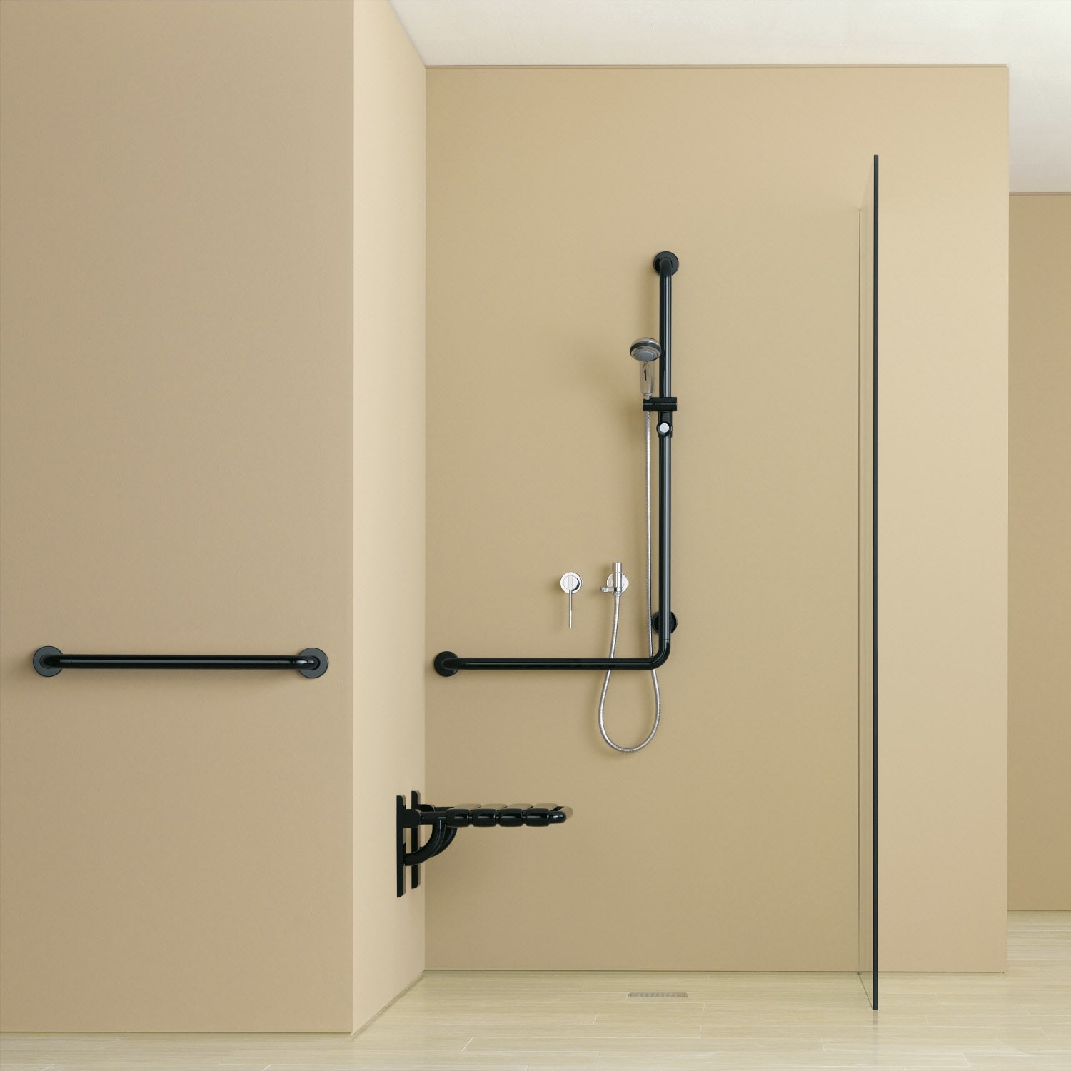 - Montage an der Wand mit wandspezifischem Befestigungsmaterial und Rosetten von HEWI