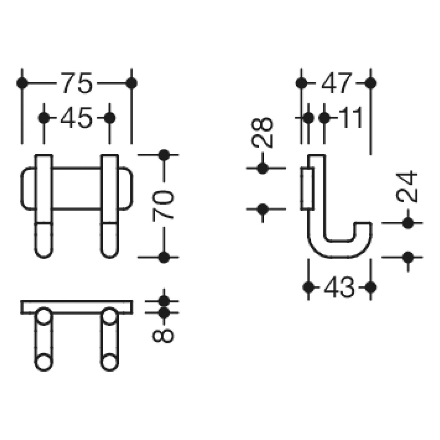 - Doppelhaken mit zwei rechtwinklig gebogenen Haken im Rundrohrdesign auf einer flachen Sockelleiste mit abgerundeten Ecken