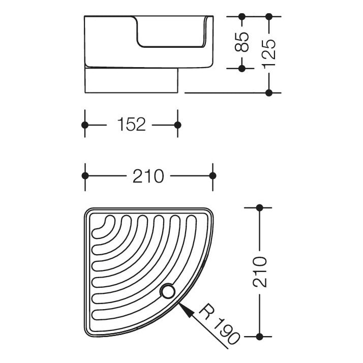 - rechtwinklig mit einem Viertelkreis geformte Ablage mit hohen Seitenwänden und Wasserablauf