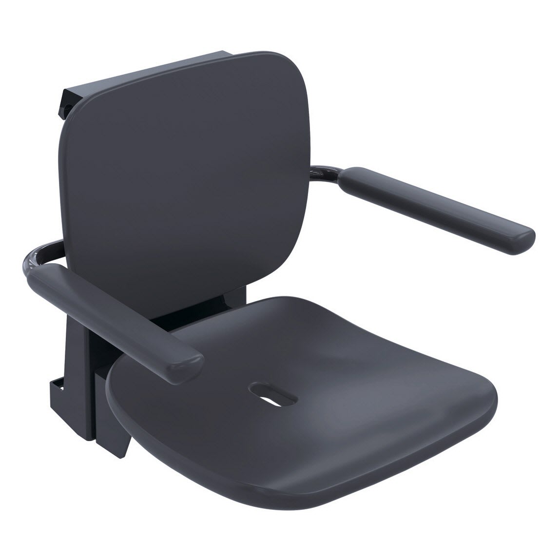 - Einhängung aus Edelstahl, pulverbeschichtet in den HEWI Farben Signalweiß, glänzend mit Sitz-/Rückenfläche und Armlehnen aus hochwertigem PUR/Integral-Hartschaum in SD (Signalweiß, matt) oder Einhängung in Anthrazit, glänzend mit Sitz-/Rückenfläche und Armlehnen in DR (Anthrazit, matt) mit hochglänzend verchromten Designelementen