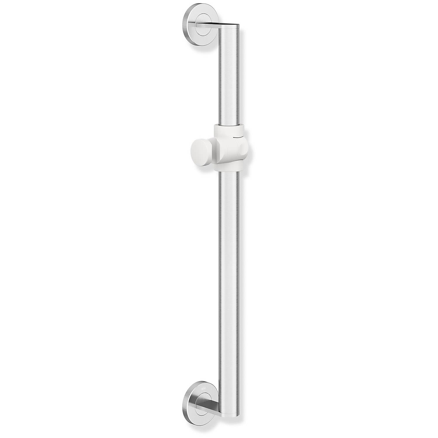 Brausehalter kann stufenlos geneigt und nach Betätigen einer großflächigen Drucktaste in der Höhe verstellt werden