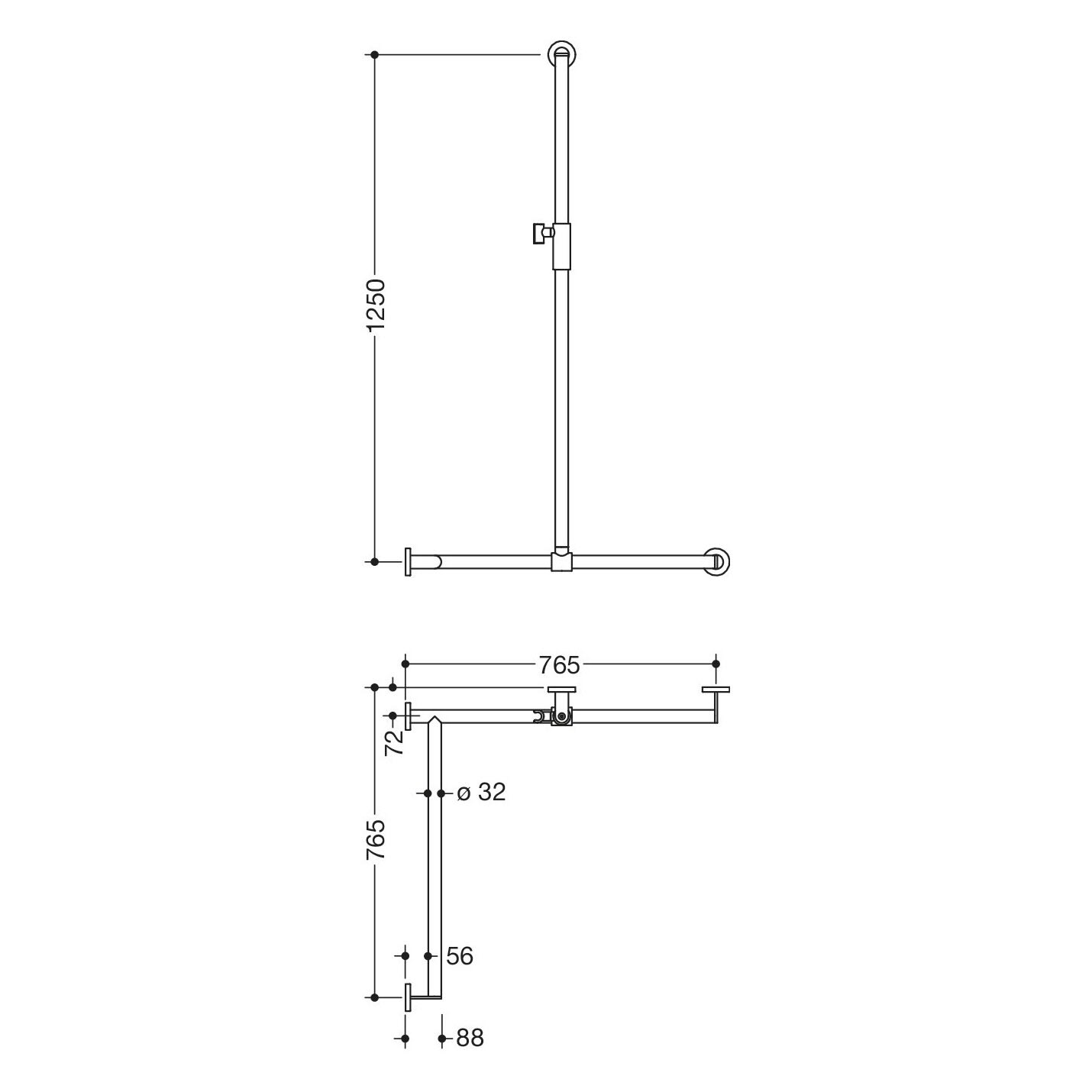 - senkrecht und waagerecht angeordnete, im rechten Winkel verbundene Stangen mit Befestigungsrosetten und magnetischem Brausehalter