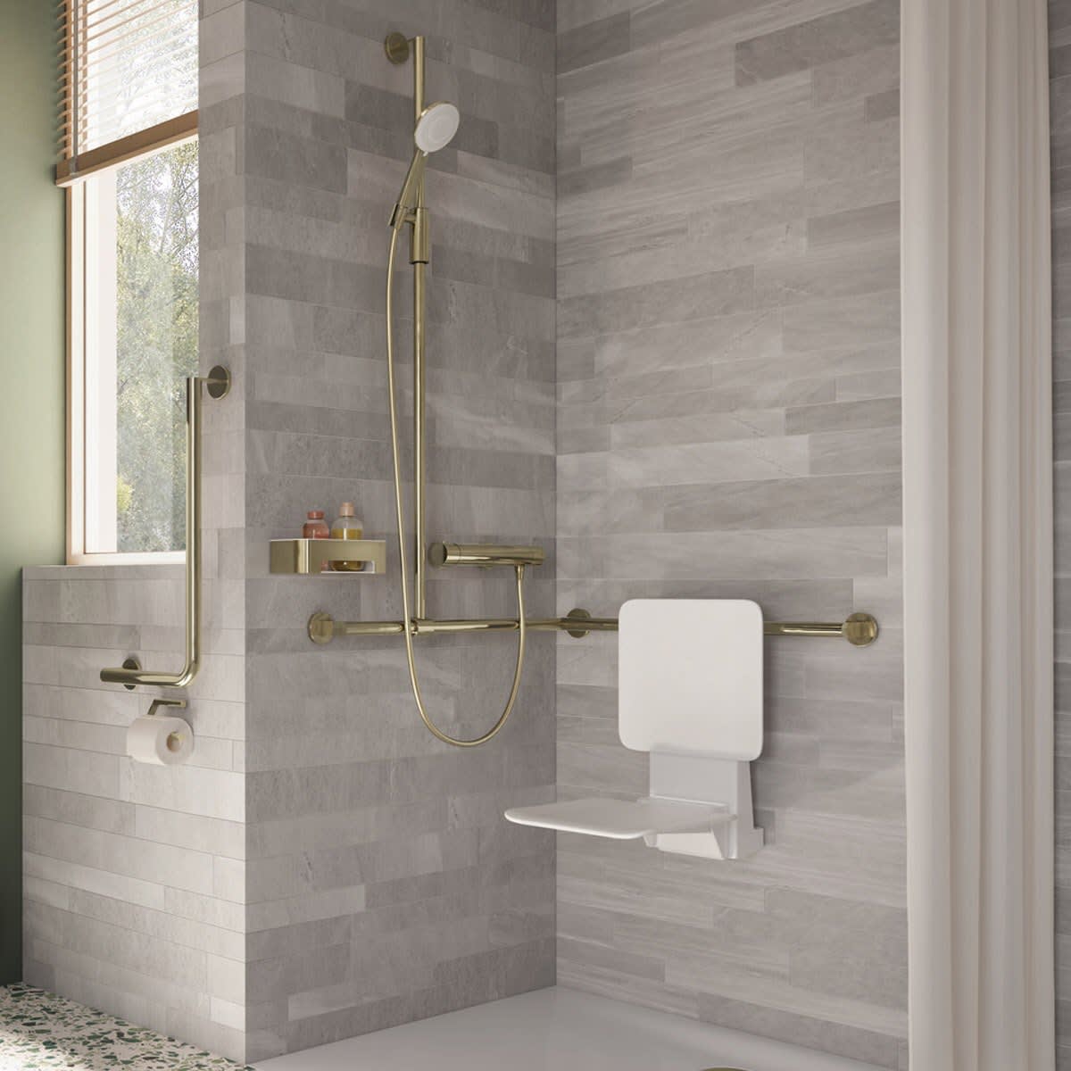 HEWI System 900 Duschhandlauf mit verschiebbarer Brausehalterstange mit Magnetbrausehalter 76,5 cm, rechts