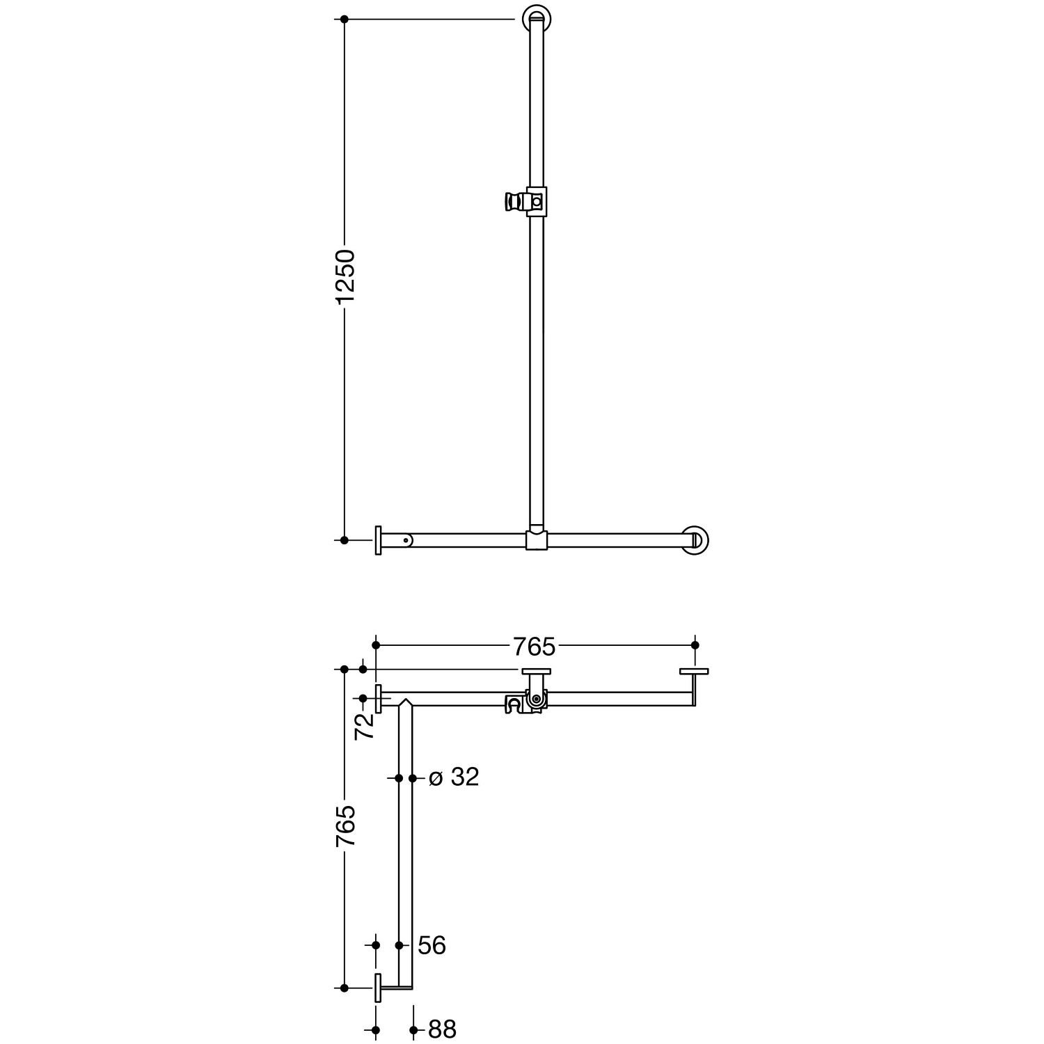 - senkrecht und waagerecht angeordnete, im rechten Winkel verbundene Stangen mit Befestigungsrosetten und Brausehalter