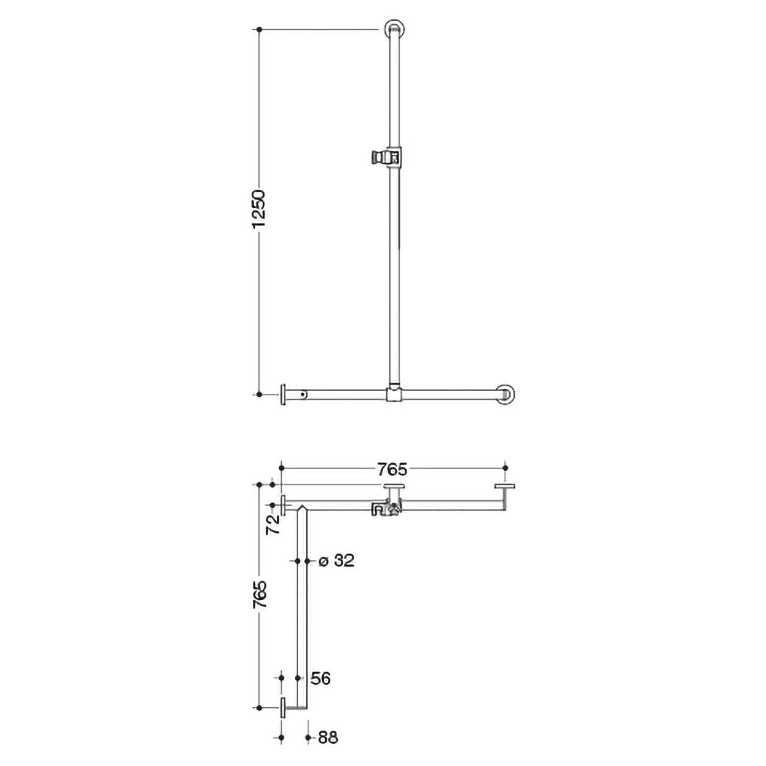- senkrecht und waagerecht angeordnete, im rechten Winkel verbundene Stangen mit Befestigungsrosetten und Brausehalter
