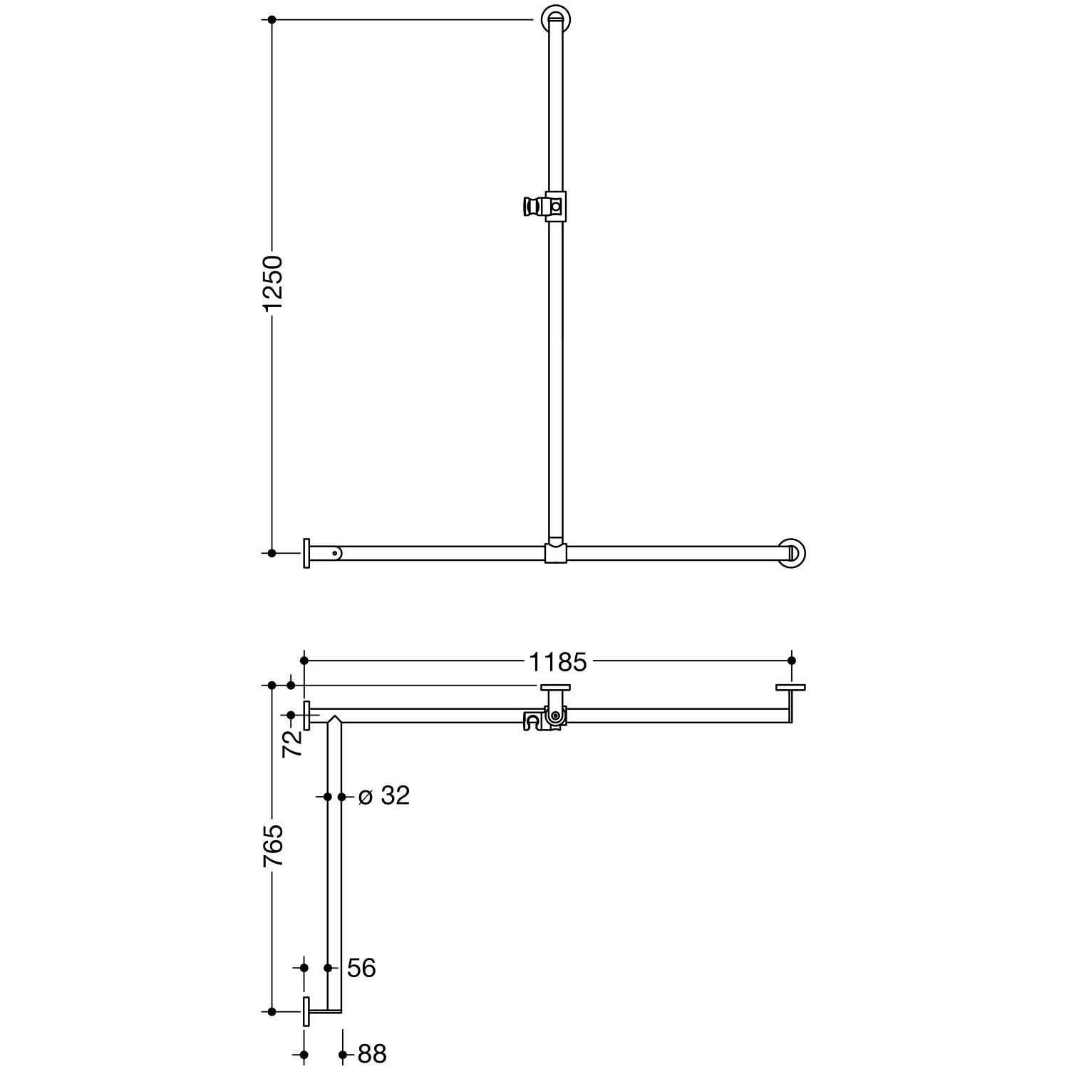 - senkrecht und waagerecht angeordnete, im rechten Winkel verbundene Stangen mit Befestigungsrosetten und Brausehalter